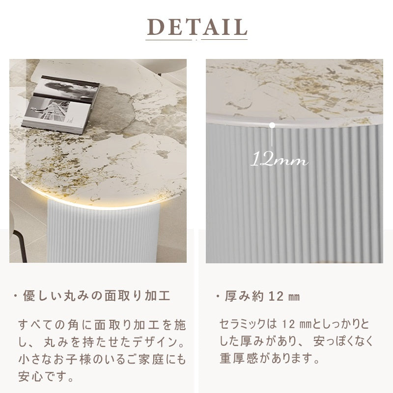 ◆商品説明 天板に耐熱・耐久性に優れたセラミックを使用したダイニングテーブル。 ■POINT1 耐摩耗と硬度 セラミックは硬く、傷がつきにくく、耐久性が高いです。 ■POINT2 耐熱 熱い鍋や器具を直接置いても、表面が損傷しにくいため、キッチンなどでの使用に適しています。 ■POINT3 気軽にお手入れ 通常、水拭きや中性洗剤を使って気軽にお手入れできます。 ■POINT4 防水 液体の吸収率はほぼ0%で、水分や液体が内部に侵入するのを防ぎます。 ■POINT5 耐凍 水分がセラミック内部に浸透しにくく、凍結による膨張からくる破損のリスクが低いです。 ■POINT6 紫外線防護 セラミックの表面は釉薬と呼ばれるガラス質のコーティングで覆われています。この釉薬層は紫外線に対して防護機能を果たします。 ■POINT7. 5年保証付きで長く愛用可能 長期間安心してお使いいただける、信頼の保証付きです。 |