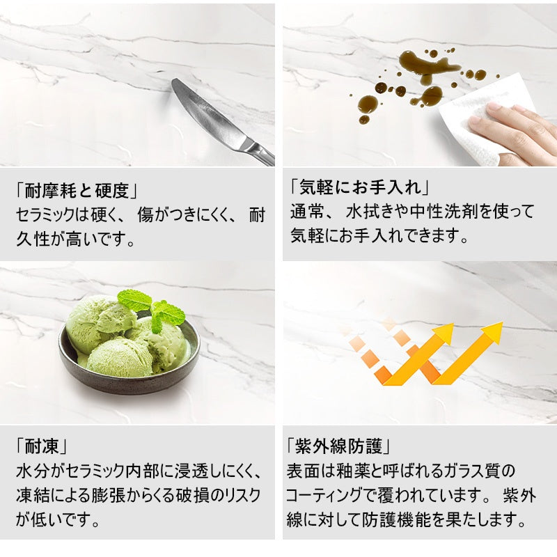 | ポイント | 丸いデザインとセラミック天板の大理石柄が特徴のローテーブル。リビングやソファ周りにスタイリッシュな印象を与えます。 ■POINT1 耐摩耗と硬度 セラミックは硬く、傷がつきにくく、耐久性が高いです。 ■POINT2 耐熱 熱い鍋や器具を直接置いても、表面が損傷しにくいため、キッチンなどでの使用に適しています。 ■POINT3 気軽にお手入れ 通常、水拭きや中性洗剤を使って気軽にお手入れできます。 ■POINT4 防水 液体の吸収率はほぼ0%で、水分や液体が内部に侵入するのを防ぎます。 ■POINT5 耐凍 水分がセラミック内部に浸透しにくく、凍結による膨張からくる破損のリスクが低いです。 ■POINT6 紫外線防護 セラミックの表面は釉薬と呼ばれるガラス質のコーティングで覆われています。この釉薬層は紫外線に対して防護機能を果たします。 |