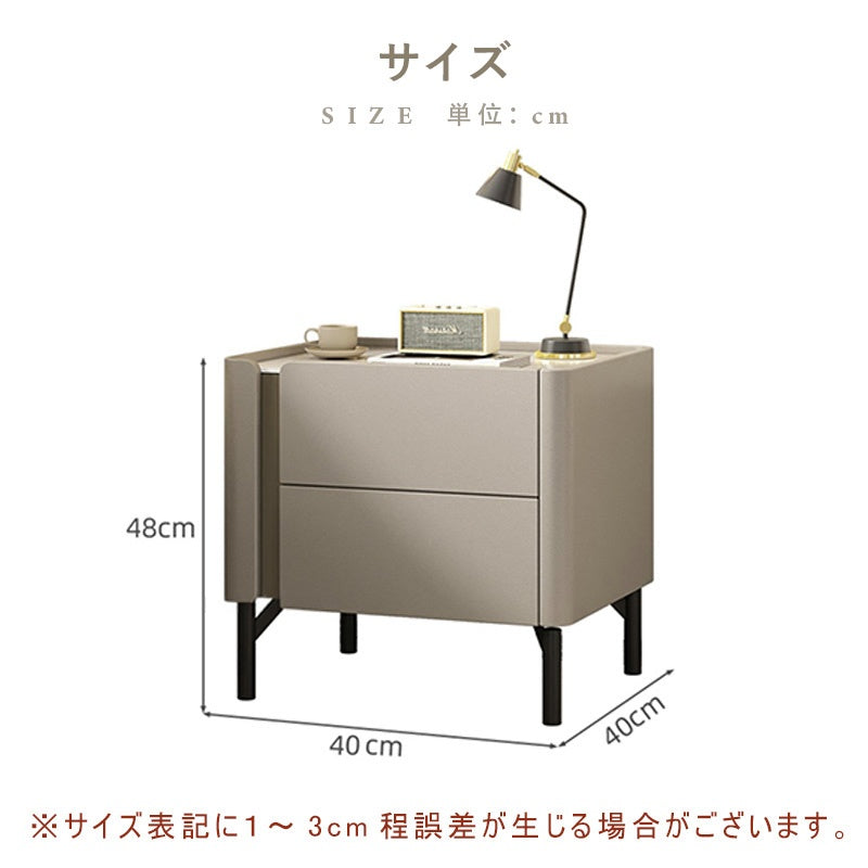 | ポイント | 現代的なデザインでシルエットのナイトテーブル。 ■POINT1 リモコンや雑誌スッキリ収納 奥側の収納スペースには、新聞や雑誌などの大きめの本や文庫本やDVDも収納可能です。 ■POINT2 くつろぎの時間を更に快適に 生活感あるものをすっきり収納できます。雑多なものを隠すことで、美しい空間を保つことができます。 ソファやベッドでくつろぐ時間を、より快適なものにしてくれること間違いなしです! ■POINT3 滑らかスライドレール 軽い力でラクに引き出すことできる! ■POINT4 けが防止・面取り 角丸のデザインが、安全性とスタイリッシュさを両立させます。 ■POINT5 手触り良いPUレザー チェストの本体部分は、お手入れ簡単でやわらかな肌触りと重厚感のあるPU(合皮)ソフトレザーを使用しました。 |