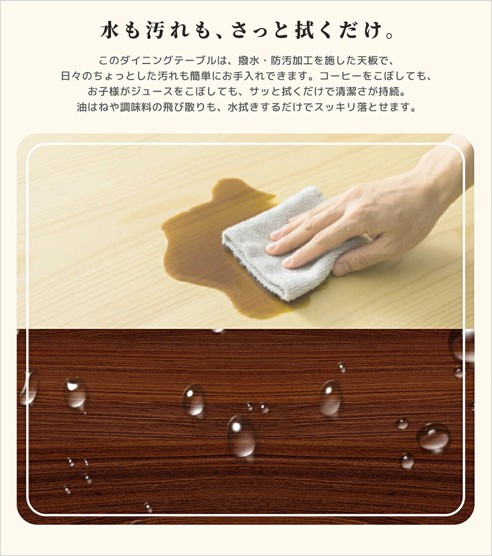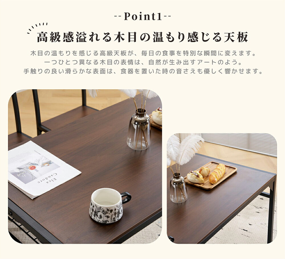 ◆商品説明 ■POINT1 コンパクト空間にぴったりの理想的なダイニングテーブル シンプルでありながら実用的なデザインが、温もりある食卓を演出します。シンプルな生活を過ごしたいなら、やはりこれかな。柔らかでダイニングテーブルを囲んで、一息できる時間をお過ごしください。 ■POINT2 高級感溢れる 木目の温もり感じる天板 木目の温もりを感じる高級天板が、毎日の食事を特別な瞬間に変えます。一つひとつ異なる木目の表情は、自然が生み出すアートのよう。手触りの良い滑らかな表面は、食器を置いた時の音さえも優しく響かせます。 ■POINT3 卓下収納ラックで快適な片付け空間を実現 テーブルの下に設けられた頑丈なスチール製ラックが、いつでも整理整頓された生活をサポート。リビングでよく使う雑誌やリモコン、お子様のおもちゃなど、気になる小物をさっと収納できる便利さです。「テーブル周りがいつも整理されていると、心まで軽くなる」というお声を多数いただいています。この収納ラックがあれば、探し物にイライラすることもなく、快適な生活リズムを作り出せます。 ■POINT4 4本脚デザインの確かな安定感で、食卓の安心を追求 作業机やダイニングテーブル、ハイテーブルなど、様々な用途で使用できます。1台あると様々なシーンで活躍します。 ■POINT5 水や汚れ、摩擦に強い粉体塗装スチール素材 テーブルの要である支柱は、安定感抜群で頑丈なパイプを使用。揺れたりせずに安心してご使用いただけます。粉体塗装を施したから、クリーンは簡単、きれいな状態を保っていただけます。 ■POINT6 足組みでも快適な座高設計 テーブルの下は高さ約 76cm とゆったり使えるスペースを確保。足元を広げて使え、ゆったり快適にくつろげます。 |