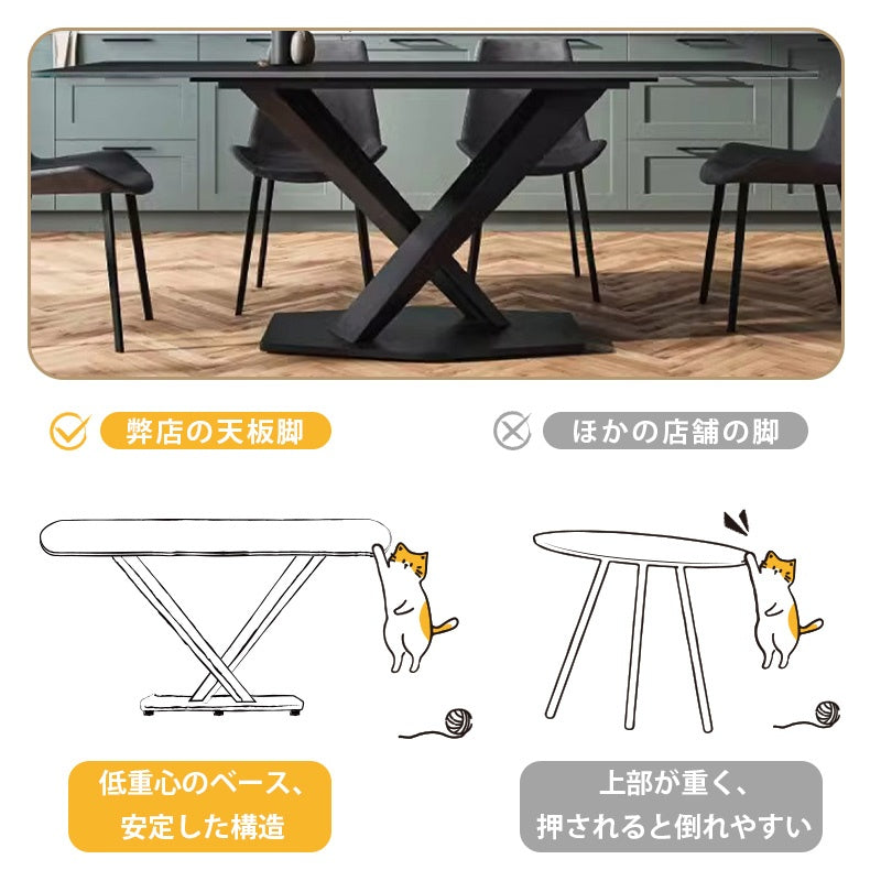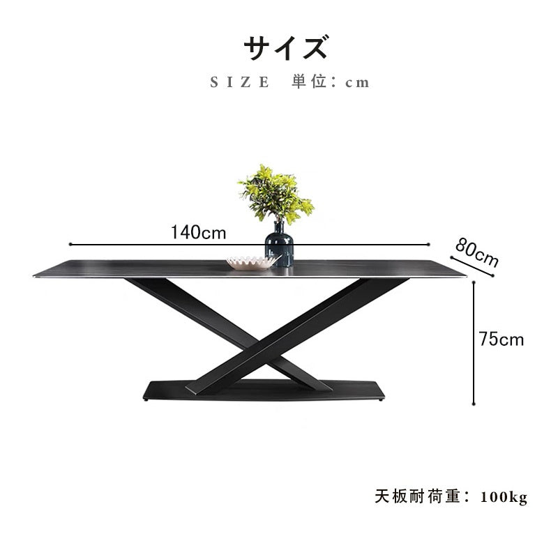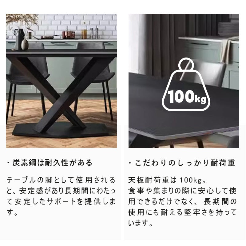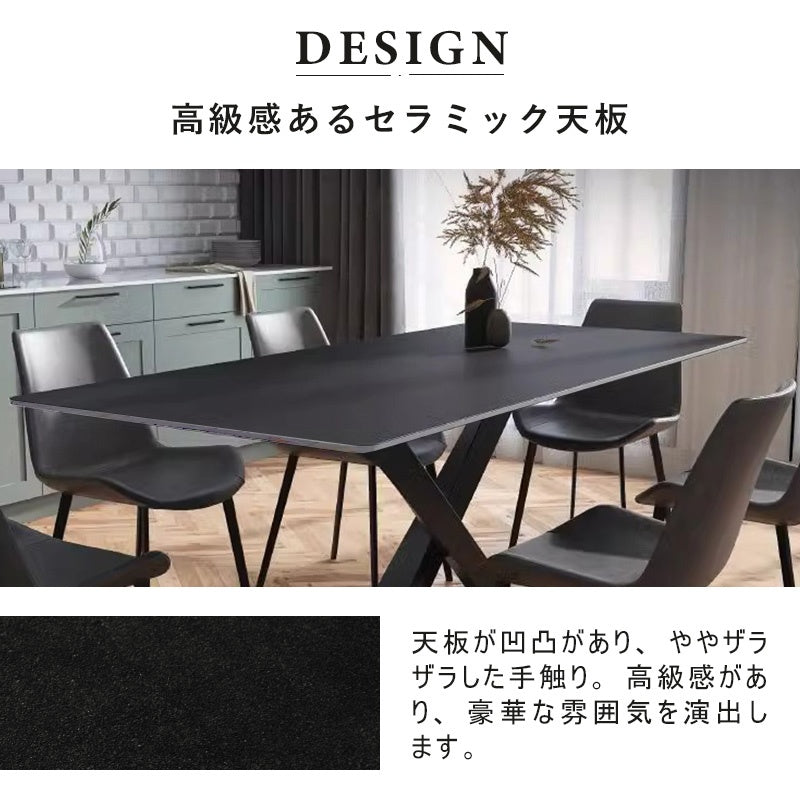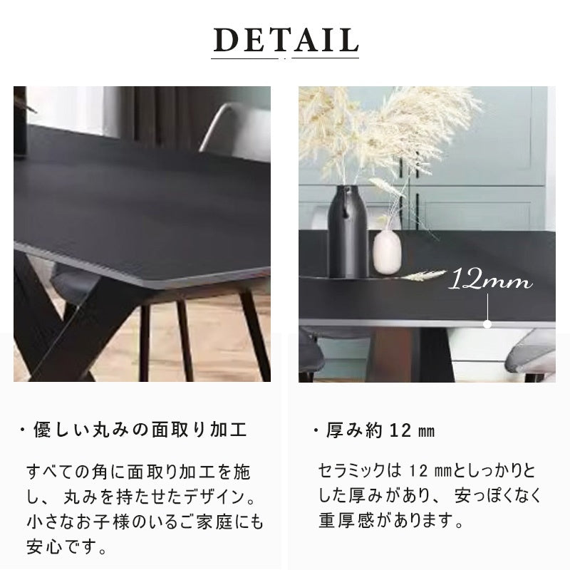 | ポイント | 洗練されたミニマリストデザインとモダンな感覚を組み合わせたダイニングテーブル。黒い艶消しセラミック天板は、エレガントでありながら実用性も兼ね備えています。耐熱性や耐摩耗性に優れるセラミック素材は、日常の使用に強く、お手入れが簡単です。X型の脚デザインで、安定感とダイナミックなスタイルを提供します。 ■POINT1熱に強い 耐熱性が高く、短時間であれば高温のフライパンや鍋などを直接置いても大丈夫です。(しかし、天板にとっては良い事ではないので、出来るだけ何かを敷いて頂くことをお薦め致します。) ■POINT2 傷がつきにくい セラミック天板には塗装の膜が無いので、テーブル表面を傷める心配がありません。例えば、金属より高硬度なため、まな板代わりに使っても傷がつきません。タワシでゴシゴシ洗っても大丈夫な仕様になっています。 ■POINT3 汚れに強い セラミックトップは熱に強く、傷がつきにくいだけではなく、食材や油などの汚れも染み込みません。紫外線で色あせることもありませんので、いつまでもきれいな状態を保ちます。さらにアルコールスプレーなどを使用することで、除菌もできるのでいつでも清潔にお使い頂けます。全体的に丸みを帯びたデザインで、柔らかい印象を与えます。 ■POINT4 特徴のある素材感、質感が高い セラミックトップの表面は、焼きものならではの凹凸のあるテクスチャ。従来の天板素材とは全く異なる素材感です。また色あせや変色の原因となる空気や紫外線に対しても、耐性が強いので、綺麗な天板が長持ちします。 |