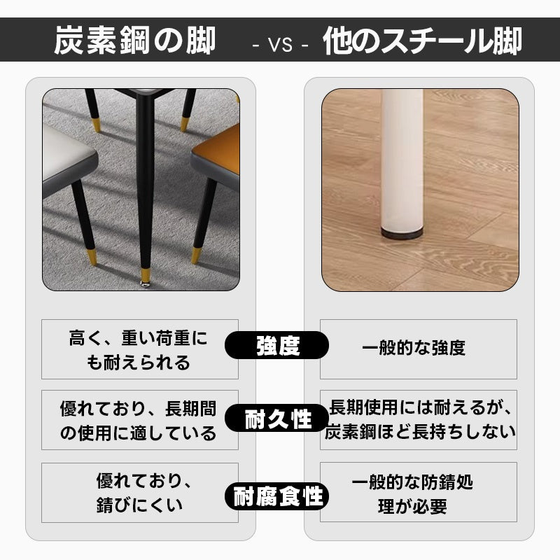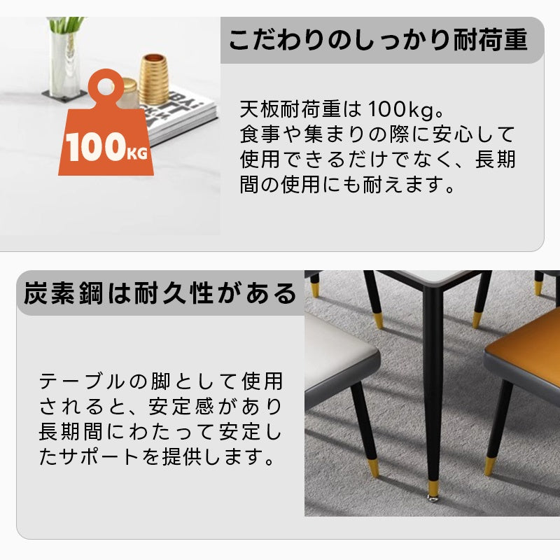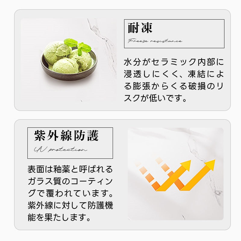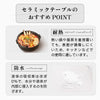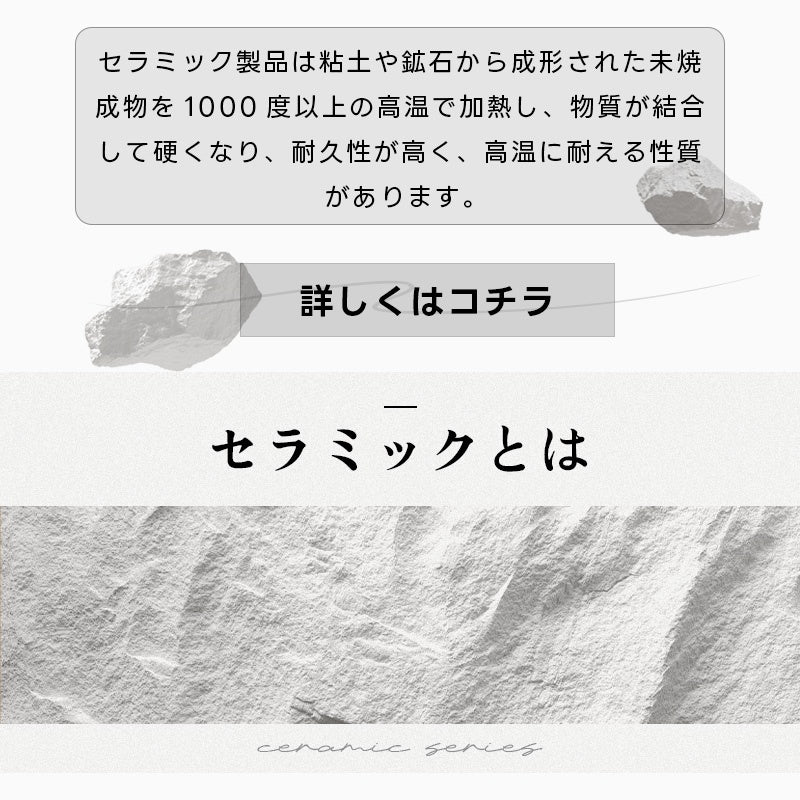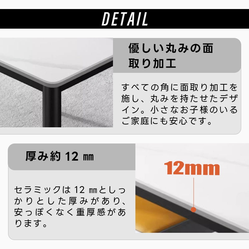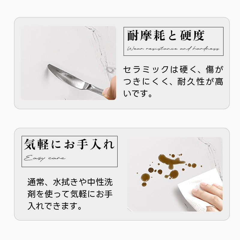 ポイント | ◆商品説明 天板に耐熱・耐久性に優れたセラミックを使用したダイニングテーブル。 ■POINT1 耐摩耗と硬度 セラミックは硬く、傷がつきにくく、耐久性が高いです。 ■POINT2 耐熱 熱い鍋や器具を直接置いても、表面が損傷しにくいため、キッチンなどでの使用に適しています。 ■POINT3 気軽にお手入れ 通常、水拭きや中性洗剤を使って気軽にお手入れできます。 ■POINT4 防水 液体の吸収率はほぼ0%で、水分や液体が内部に侵入するのを防ぎます。 ■POINT5 耐凍 水分がセラミック内部に浸透しにくく、凍結による膨張からくる破損のリスクが低いです。 ■POINT6 紫外線防護 セラミックの表面は釉薬と呼ばれるガラス質のコーティングで覆われています。この釉薬層は紫外線に対して防護機能を果たします。 ■POINT7. 5年保証付きで長く愛用可能 長期間安心してお使いいただける、信頼の保証付きです。 |