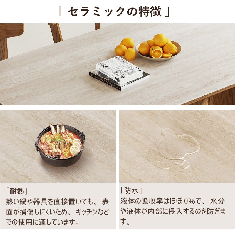 商品名 ダイニングテーブル 商品番号 anqiujj-table-002 生産国 中国 組立状態 要組立品(組立説明書を同梱発送いたします) 素材 セラミック、天然木 サイズ(約) ・幅140x奥行80cm×高さ75cm ・幅160x奥行80cm×高さ75cm ・幅180x奥行80cm×高さ75cm ポイント ◆商品説明 天板に耐熱・耐久性に優れたセラミックを使用したダイニングテーブル。 ■POINT1 耐摩耗と硬度 セラミックは硬く、傷がつきにくく、耐久性が高いです。 ■POINT2 耐熱 熱い鍋や器具を直接置いても、表面が損傷しにくいため、キッチンなどでの使用に適しています。 ■POINT3 気軽にお手入れ 通常、水拭きや中性洗剤を使って気軽にお手入れできます。 ■POINT4 防水 液体の吸収率はほぼ0%で、水分や液体が内部に侵入するのを防ぎます。 ■POINT5 耐凍 水分がセラミック内部に浸透しにくく、凍結による膨張からくる破損のリスクが低いです。 ■POINT6 紫外線防護 セラミックの表面は釉薬と呼ばれるガラス質のコーティングで覆われています。 この釉薬層は紫外線に対して防護機能を果たします。...