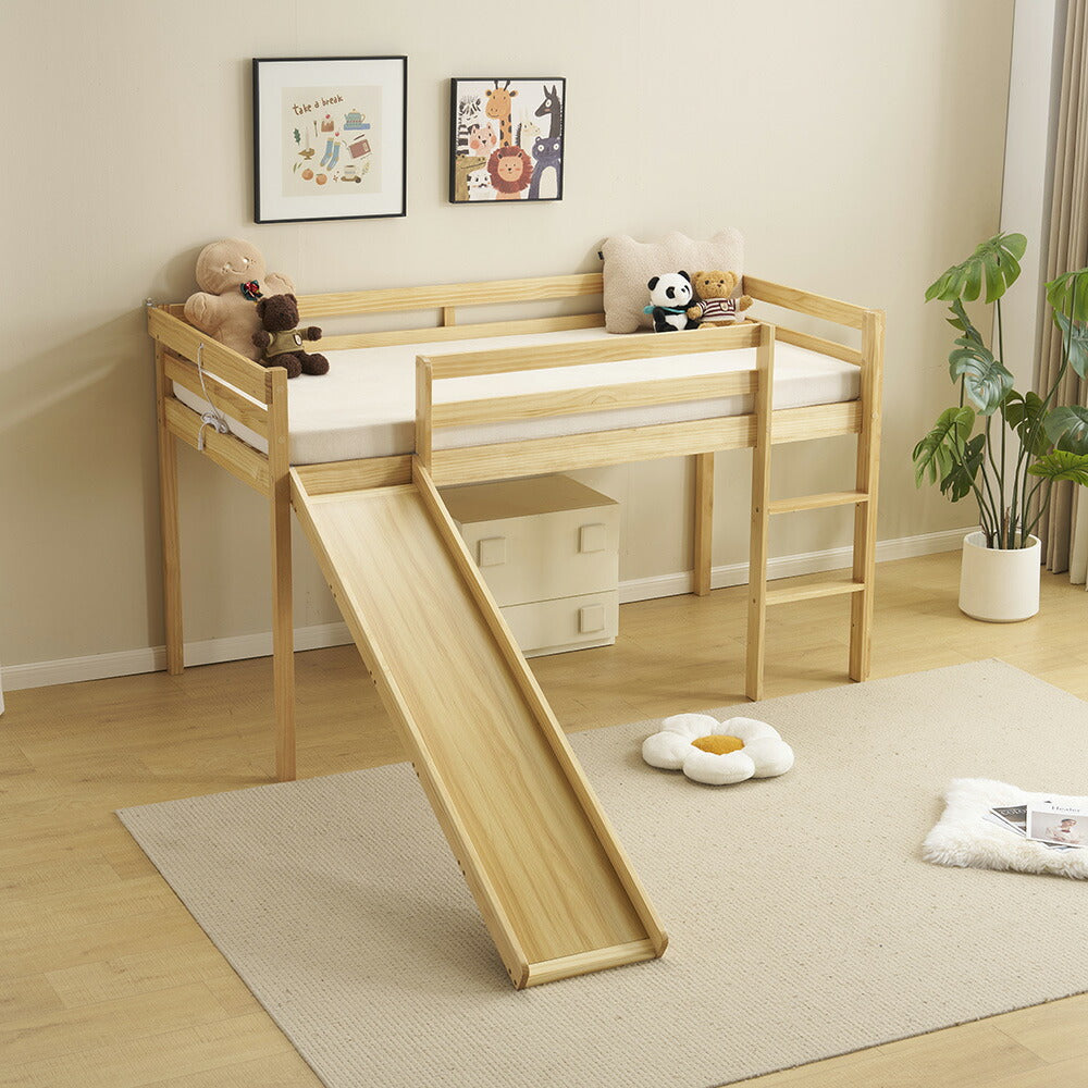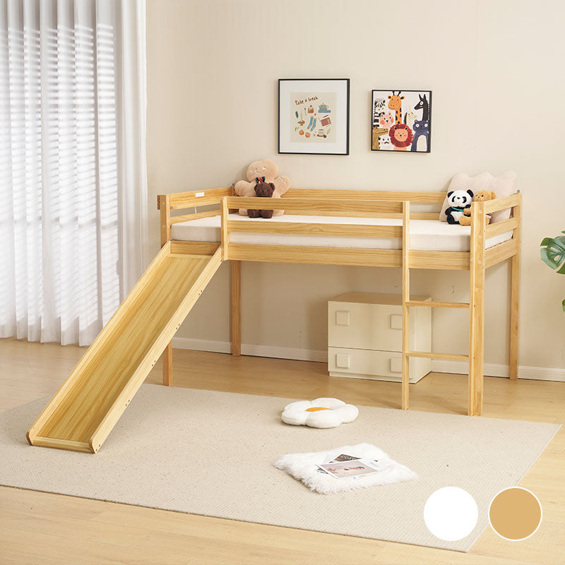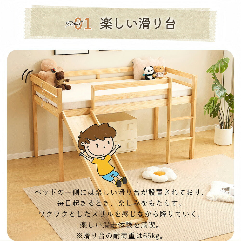 ◆商品説明 ■POINT1 楽しいすべり台付きデザイン ベッドのサイドにはすべり台を設置し、毎日の起床や就寝時間が楽しいひとときに。ワクワクしながら安全に降りることができ、お子様の遊び心をくすぐります。すべり台上部には手すりを備え、安心してお使いいただけます。※安全のため、下部にはマットやカーペットの設置をおすすめします。また、すべり台と階段は左右の入れ替えが可能で、レイアウトに合わせて調整できます。 ■POINT2 安全性に配慮した一体型階段 ベッドと一体化した階段は省スペース設計で、お部屋の空間を有効活用。幅広で安定感のあるステップに加え、手すり付きで昇り降りも安心です。小さなお子様でも使いやすい設計となっています。 ■POINT3 自由に使えるベッド下スペース ベッド下には広々とした空間を確保し、収納スペースとして活用可能。キャビネットや収納ボックス、おもちゃなどを整理できるほか、お子様の遊び場やくつろぎスペースとしても使える、多用途設計です。 ■POINT4 天然木のあたたかみある素材 本体には天然パイン材を使用し、自然素材ならではのやさしい風合いと温もりを感じられます。耐久性にも優れ、長く安心してお使いいただける丈夫な構造。湿気を調整する特性により、通気性にも優れた快適な使用環境を保ちます。 |