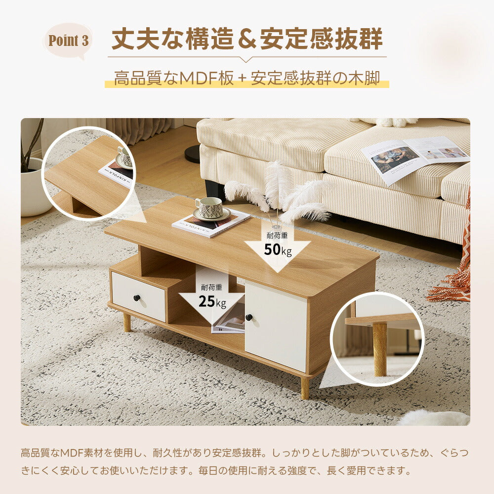 ◆商品説明 ■POINT1 収納力に優れたリビングテーブル リモコンや雑誌、ゲーム機などをまとめて収納可能。よく使う物をすぐに出し入れでき、リビングをすっきり保てます。 ■POINT2 北欧テイストのシンプルデザイン 木目調とホワイトを組み合わせた落ち着いたデザイン。空間に自然になじみ、さまざまなインテリアと相性良く使えます。 ■POINT3 テーブル兼テレビ台として使用可能 リビングテーブルとしてはもちろん、テレビ台としても使用可能。限られたスペースを有効活用できます。 ■POINT4 安定感のあるしっかり構造 MDF素材を使用し、安定感のある設計。日常使いでもぐらつきにくく、安心して使用できます。 ■POINT5 組立簡単・選べる3カラー シンプル構造で組立しやすく、説明書付き。カラーはナチュラル/ホワイト/ブラウンの3色展開です。 |