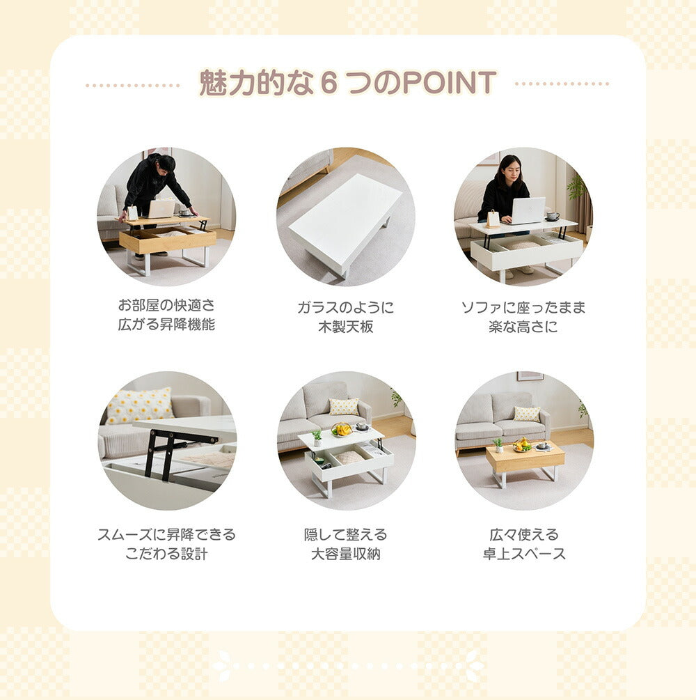 ■POINT5 高さ調節可能で使いやすい 使用シーンに合わせて天板の高さ調節が可能。ソファ前やチェア使用時など、幅広いシーンに対応します。
