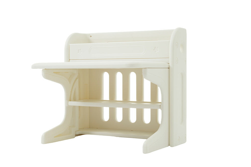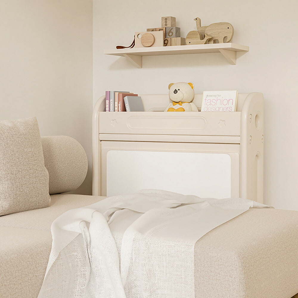 組み立てはシンプルで手軽に設置可能。ブックシェルフ付きで、絵本やノート、文房具などをすっきり収納できます。しっかりとした耐荷重設計で、日常使いにも安心してお使いいただけます。