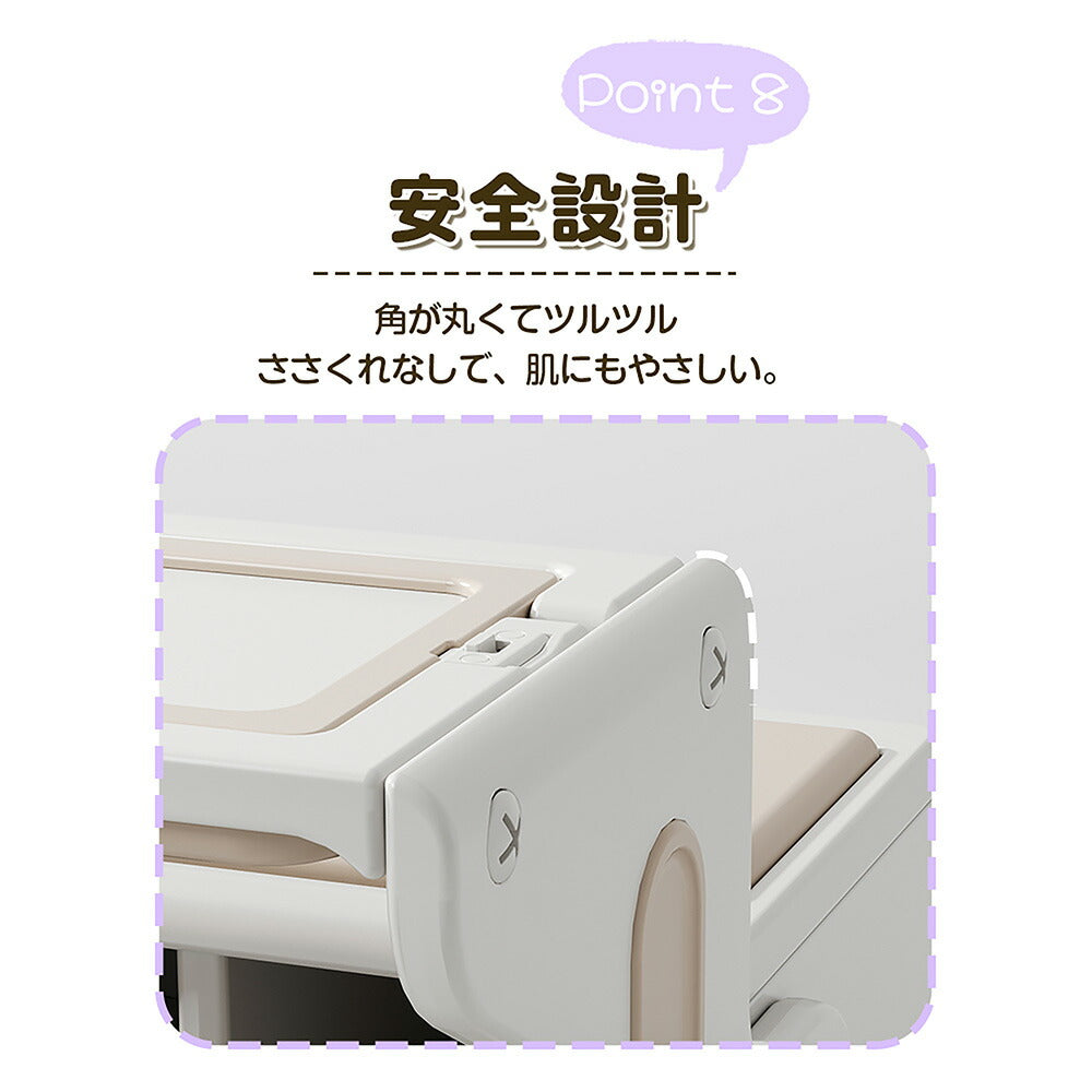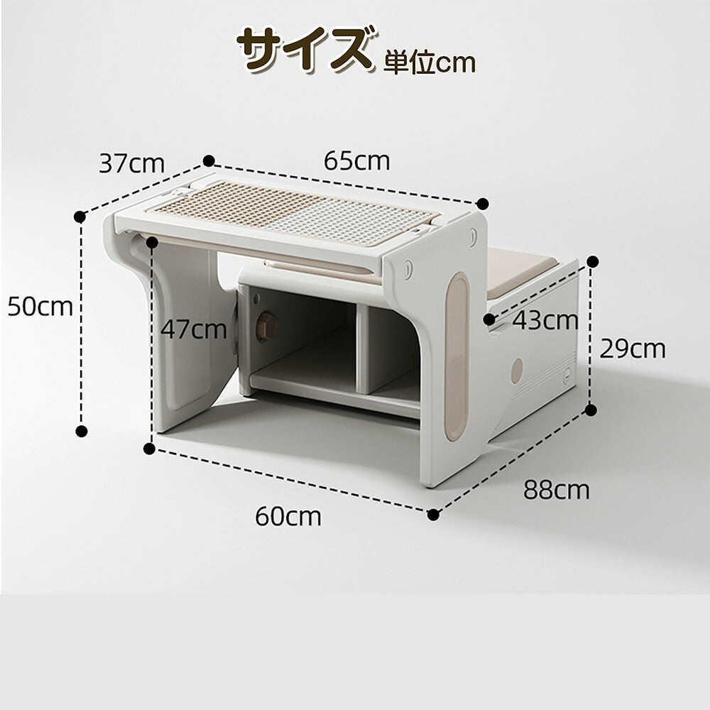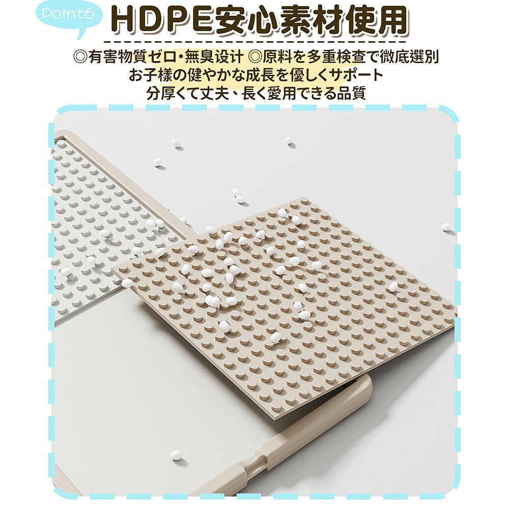 ◆商品説明 ■POINT1 4in1多機能キッズデスク 学習机・ブロックテーブル・ベンチ・収納が一体になった便利な設計。遊びも学びもこれ一台で完結し、お部屋のスペースを有効に使いながらお子様の成長をサポートします。 ■POINT2 人間工学に基づいた快適設計 「ひざ90°・足裏ぴったり」を意識した設計で、自然と背筋が伸びる正しい姿勢をサポート。長時間のお絵かきやブロック遊びでも疲れにくく、集中しやすい環境を整えます。 ■POINT3 ゆったり座れるクッション付きチェア 適度な厚みのクッションでお尻への負担を軽減。約60×43cmの広めの座面設計で、お子様がゆったり座れるだけでなく、お友達と一緒に楽しく遊ぶこともできます。 ■POINT4 リバーシブル天板で簡単切替 天板は裏返すだけの簡単操作で、ホワイトボード面とブロックプレート面を約3秒で切替可能。遊びや用途に合わせてすぐに使い分けできる便利な仕様です。 ■POINT5 自由に描けるホワイトボード仕様 思いついたアイデアやお絵かきを自由に楽しめるボード付き。書き消しもスムーズで跡が残りにくく、繰り返し使えてお子様の創造力を伸ばします。 ■POINT6 安心して使える丈夫な設計 耐荷重約80kgのしっかりとした構造で安定感抜群。角は丸く加工され、表面もなめらかに仕上げているため、お子様にもやさしく安心してお使いいただけます。 ■POINT7 安全性に配慮したHDPE素材 無臭で安全性に配慮したHDPE素材を採用。厚みのある丈夫な作りで変形しにくく、長く使える品質。お子様の毎日の遊びと学びをしっかり支えます。 |