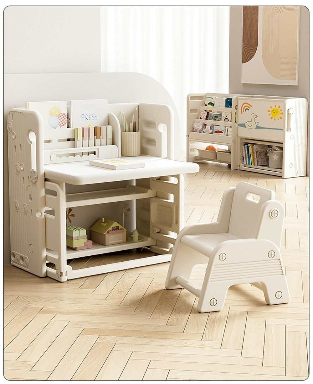折りたたみキッズデスク チェア セット キッズテーブル ミニテーブル 絵本棚付き 子供用 勉強机 学習デスク テーブル 子供用テーブル 子供机 学習デスク 机 幼児机 お絵描きデスク 棚付き ホワイト 白 こども 組み立て簡単 多機能 省スペース プレゼント