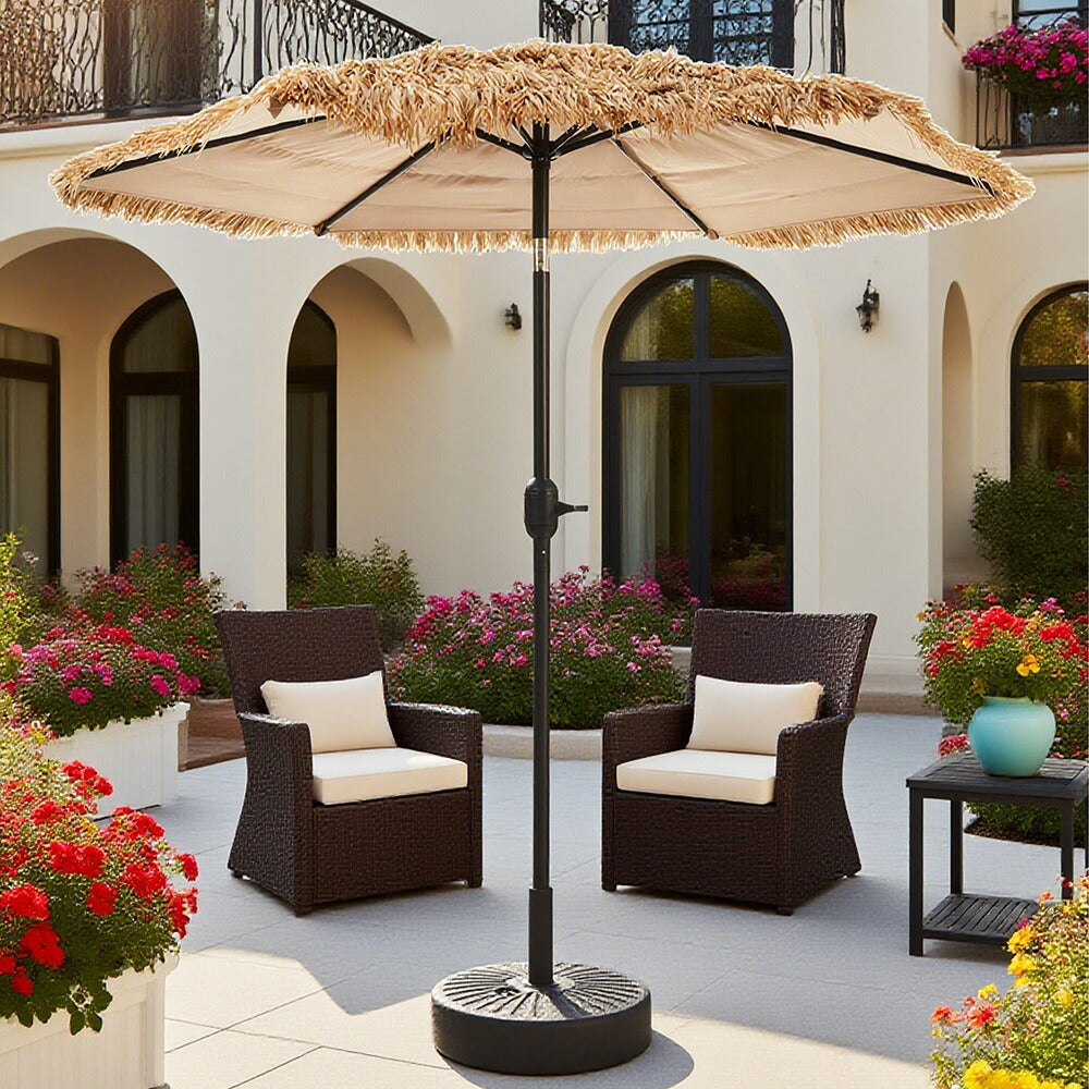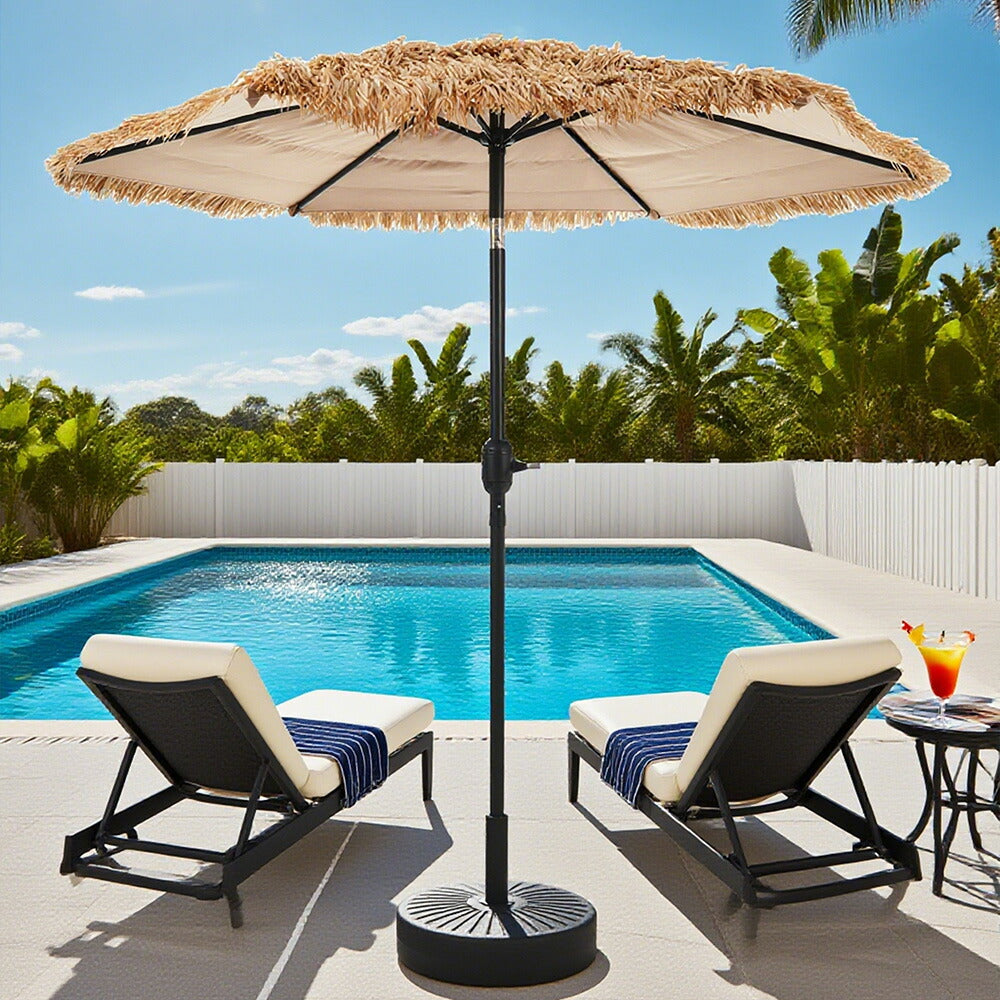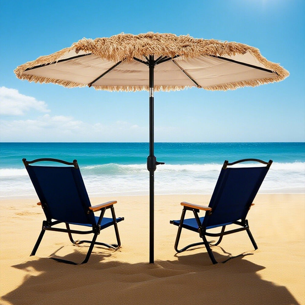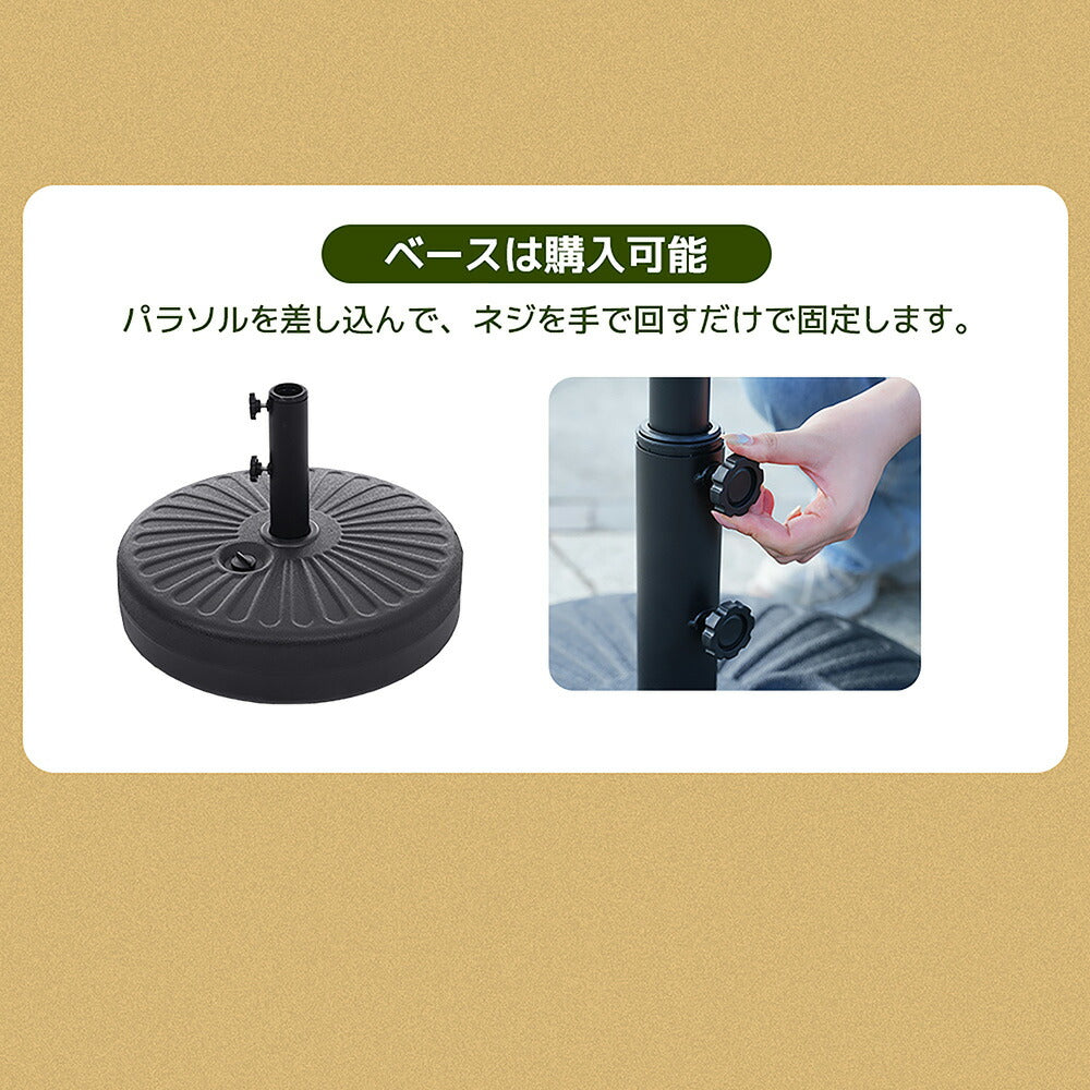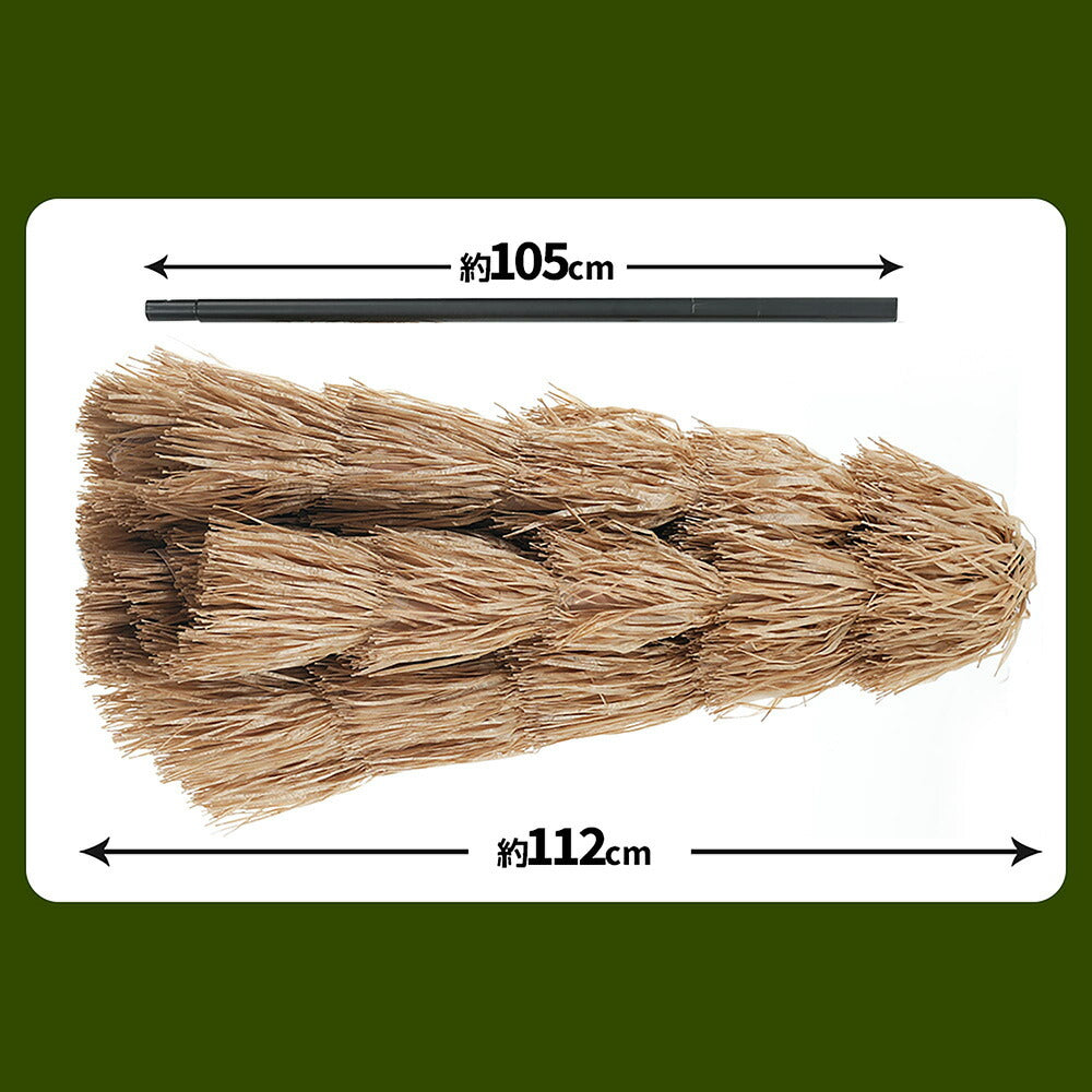 ■POINT1 ハワイアンリゾート風デザイン 自然なわら調デザインで南国リゾートの雰囲気を演出。庭やテラス、プールサイドをおしゃれで開放感のある空間に変えます。 ■POINT2 直径220cmの大型サイズ 広げると直径約220cmのワイドサイズ。テーブルやチェアをしっかり覆い、快適な日陰スペースを作ります。 ■POINT3 チルト機能で角度調整可能 ボタンを押すだけで傘の角度を最大約17度まで調整可能。太陽の位置に合わせて日差しをしっかり遮ります。 ■POINT4 UPF30+紫外線対策 UVカット加工を施した生地で紫外線をしっかりブロック。強い日差しの下でも安心して使用できます。 ■POINT5 撥水加工で屋外でも安心 撥水加工が施されているため小雨程度なら水を弾きます。屋外でも安心して使用できます。※完全防水ではありません。 ■POINT6 頑丈な金属フレーム構造 太い支柱と6本のリブでしっかり支える設計。粉体塗装フレームでサビに強く耐久性に優れています。 ■POINT7 レバー式で簡単開閉 回転レバーを回すだけでスムーズにパラソルを開閉可能。力を入れず簡単に操作できます。 ■POINT8 二段式ポールで収納便利 ポールは取り外し可能な二段式設計。持ち運びや収納がしやすく、アウトドアでも便利です。 ■POINT9 5年保証付きで安心 高品質設計で長く使用できるパラソル。安心してご利用いただける5年間保証付きです。 |