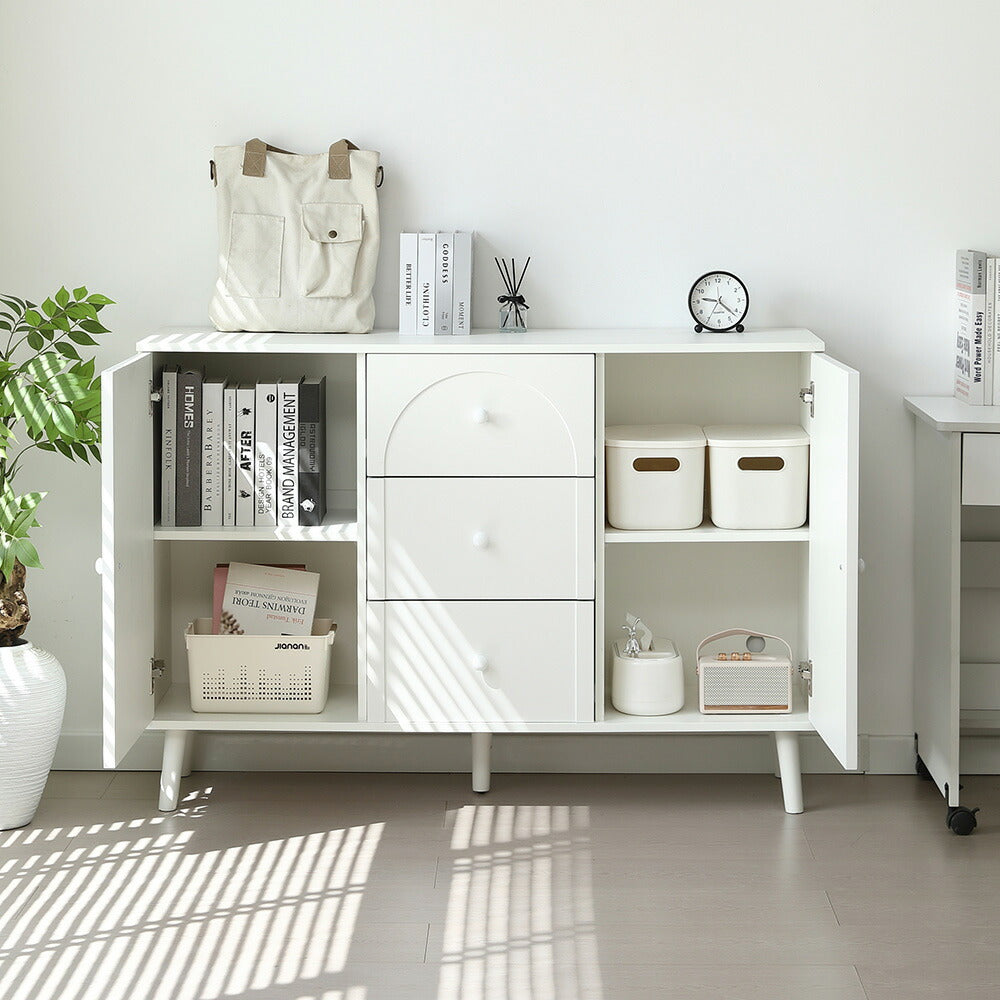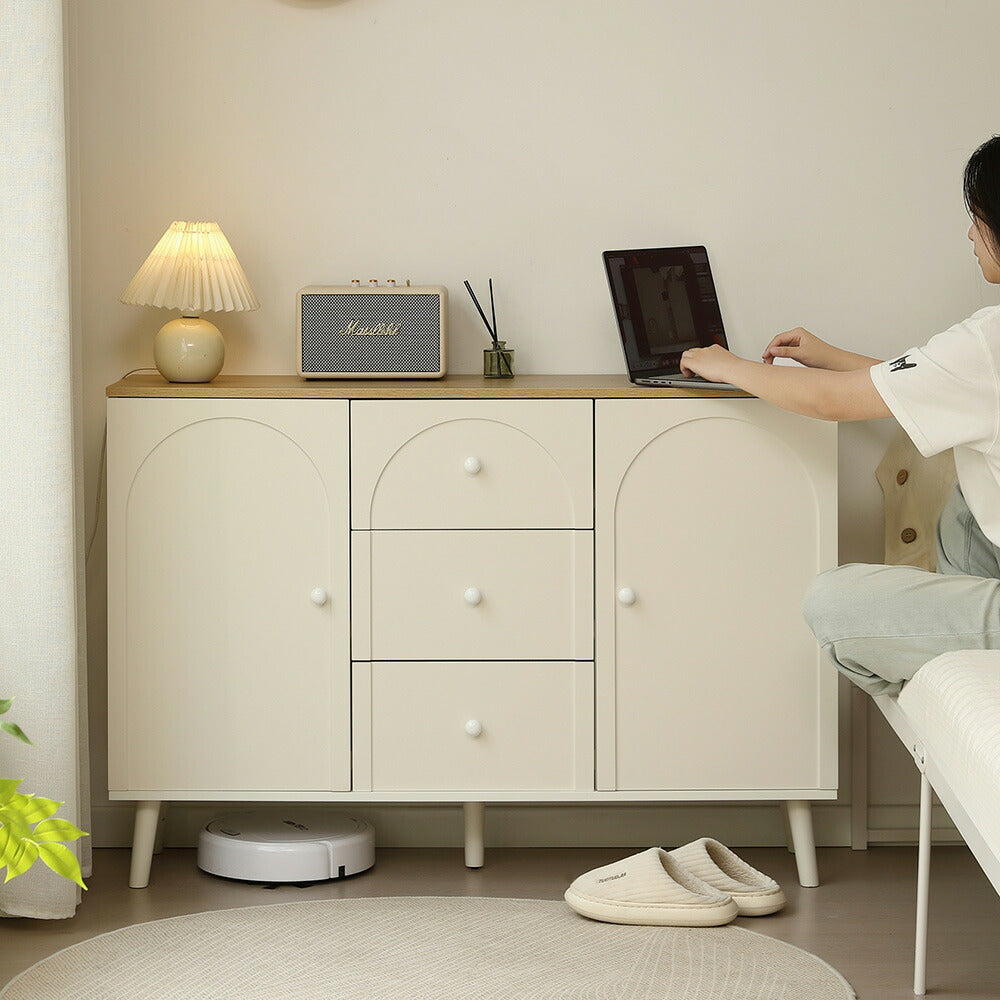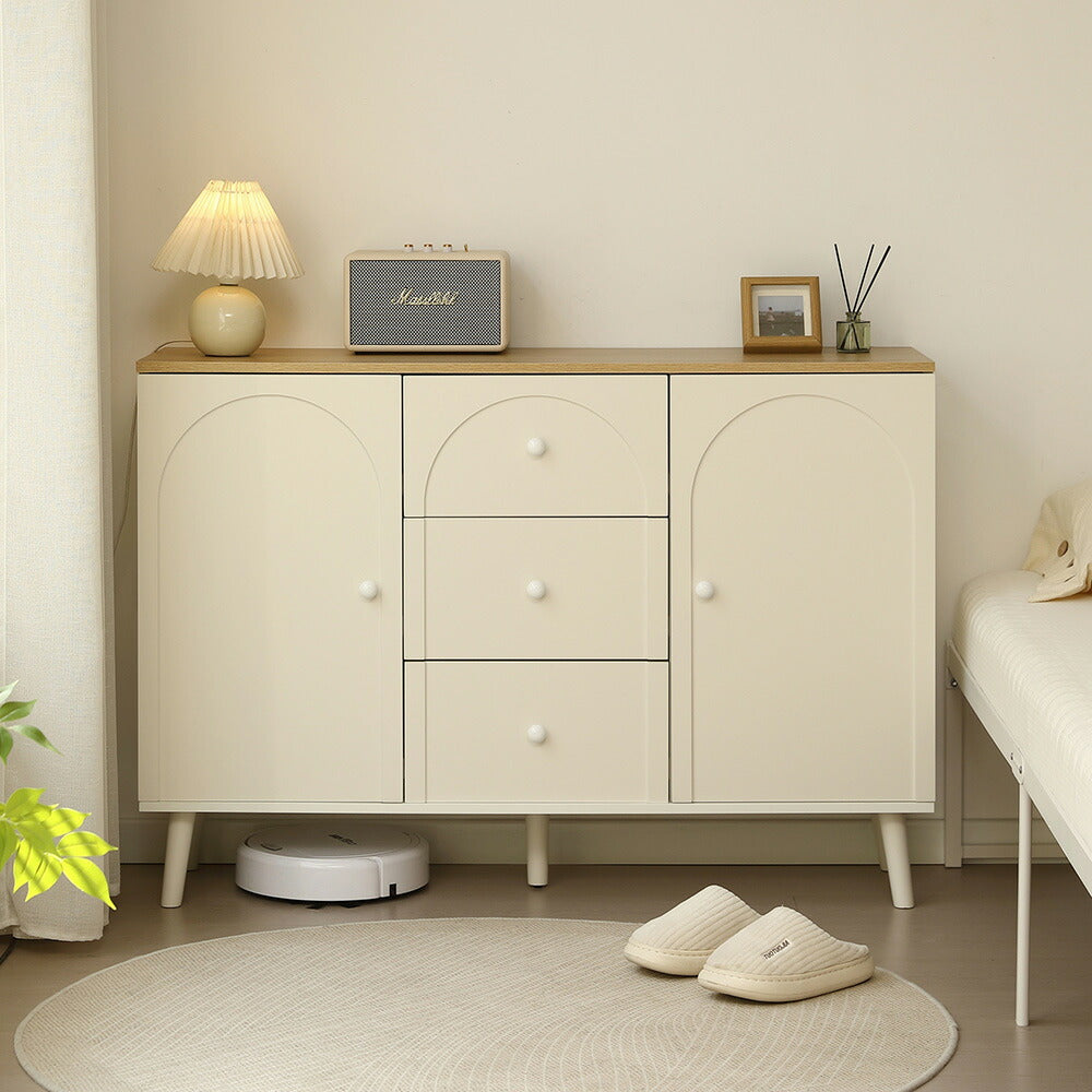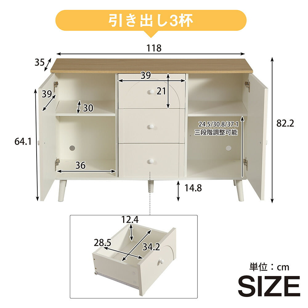 キャビネット サイドボード チェスト 引き出し付き ホワイト アイボリー 白 大容量 収納棚 リビング 収納 モダン 扉付き リビングボード おしゃれ 整理タンス 北欧 韓国風 おしゃれ 寝室 子供部屋 幅118cm 奥行35cm 高さ82cm 2Way仕様天板 可愛い