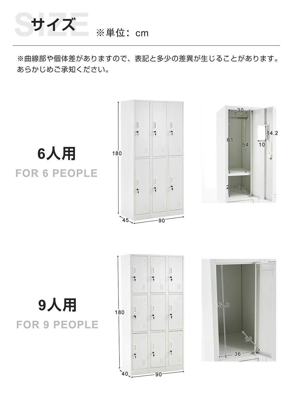 商品名 ロッカー 商品番号 djyc-shelf-110 生産国 中国 組立状態 要組立品(組立説明書を同梱発送いたします) 素材 スチール サイズ(約) ・幅90cm×奥行40cm×高さ96.5cm ポイント ◆商品説明 ■POINT1 6人用・9人用・12人用から選べる多人数対応ロッカー 利用人数や設置スペースに合わせて、6人用・9人用・12人用の3タイプから選択可能。オフィスや学校、更衣室など幅広いシーンに対応します。 ■POINT2 鍵付き仕様で私物や貴重品の管理も安心 各扉には鍵を備えており、個人ごとの荷物や衣類をしっかり保管できます。共用空間でも安心して使いやすい実用設計です。 ■POINT3 スリム設計で限られた空間にも設置しやすい 縦方向を活かしたスリムな構造で、場所を取りすぎず省スペースで設置可能。事務所やバックヤード、更衣スペースにもすっきり収まります。 ■POINT4 スチール製のしっかりした構造で業務用にも対応 本体には耐久性に優れたスチール素材を採用。日常使いはもちろん、会社・学校・施設などでの継続使用にも適した仕様です。 ■POINT5 通気口付きで収納内部の環境にも配慮 扉下部には通気口を設け、収納内部の空気がこもりにくい設計。衣類や荷物を収納する更衣ロッカーとしても使いやすい仕様です。 ■POINT6 シンプルなホワイトカラーで空間になじみやすい 清潔感のあるホワイトカラーを採用し、オフィスや学校、施設空間にも自然に調和。圧迫感を抑えながらすっきりとした印象に仕上がります。 ■POINT7 多人数用収納として整理整頓しやすい構成 収納スペースが個別に分かれているため、使用者ごとの管理がしやすく、共用環境でも整理整頓を保ちやすいロッカーです。 ■POINT8 スペアキー付きで管理しやすい安心仕様 スペアキー付きのため、管理用や予備用として保管しやすく、日常運用にも便利。複数人で使用する環境でも扱いやすい仕様です。...