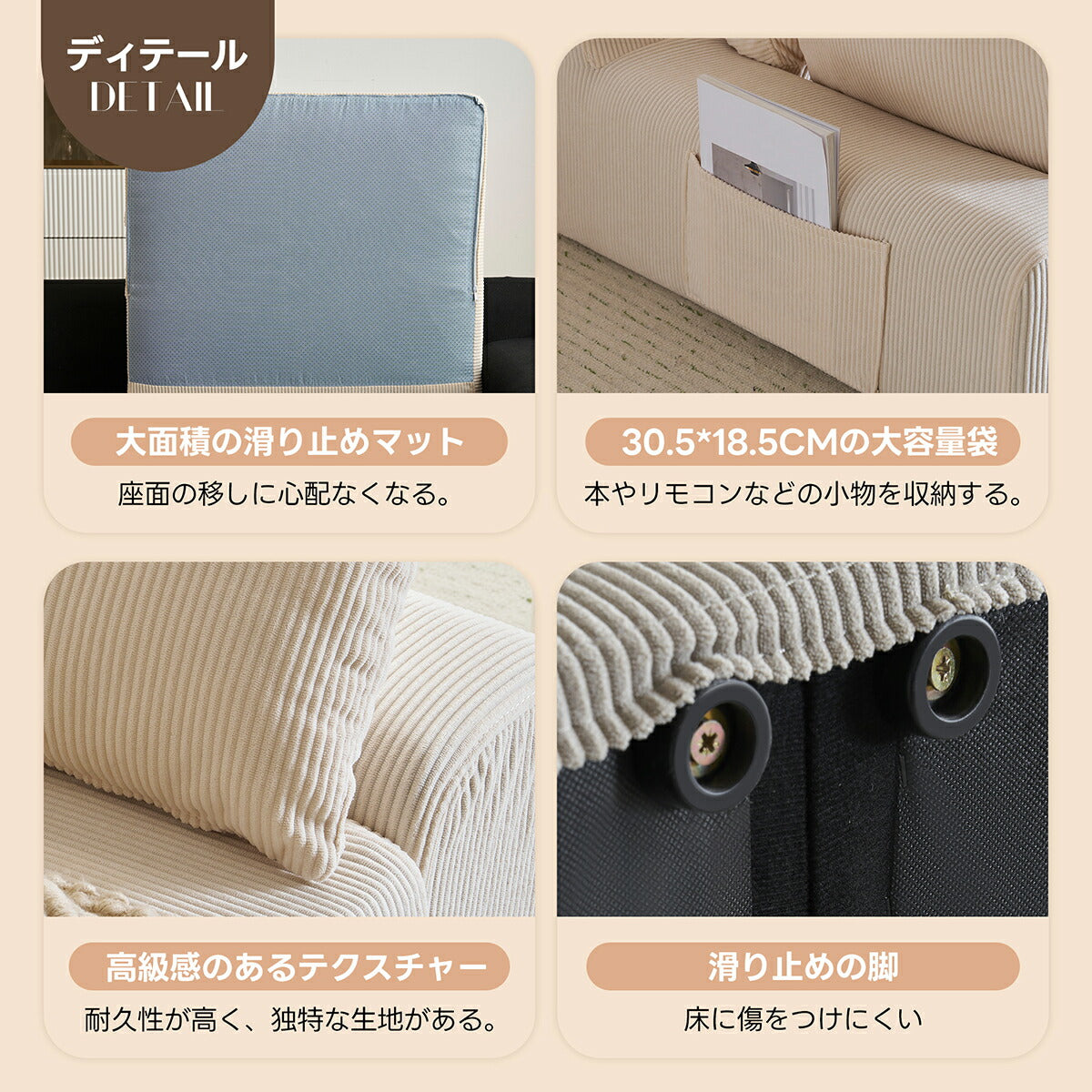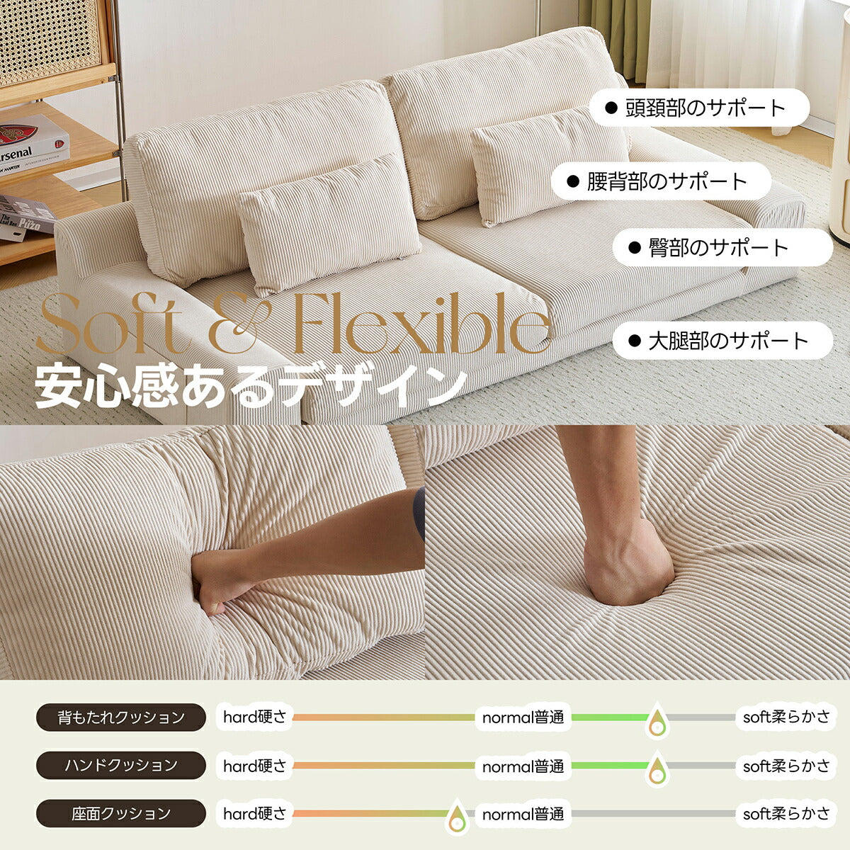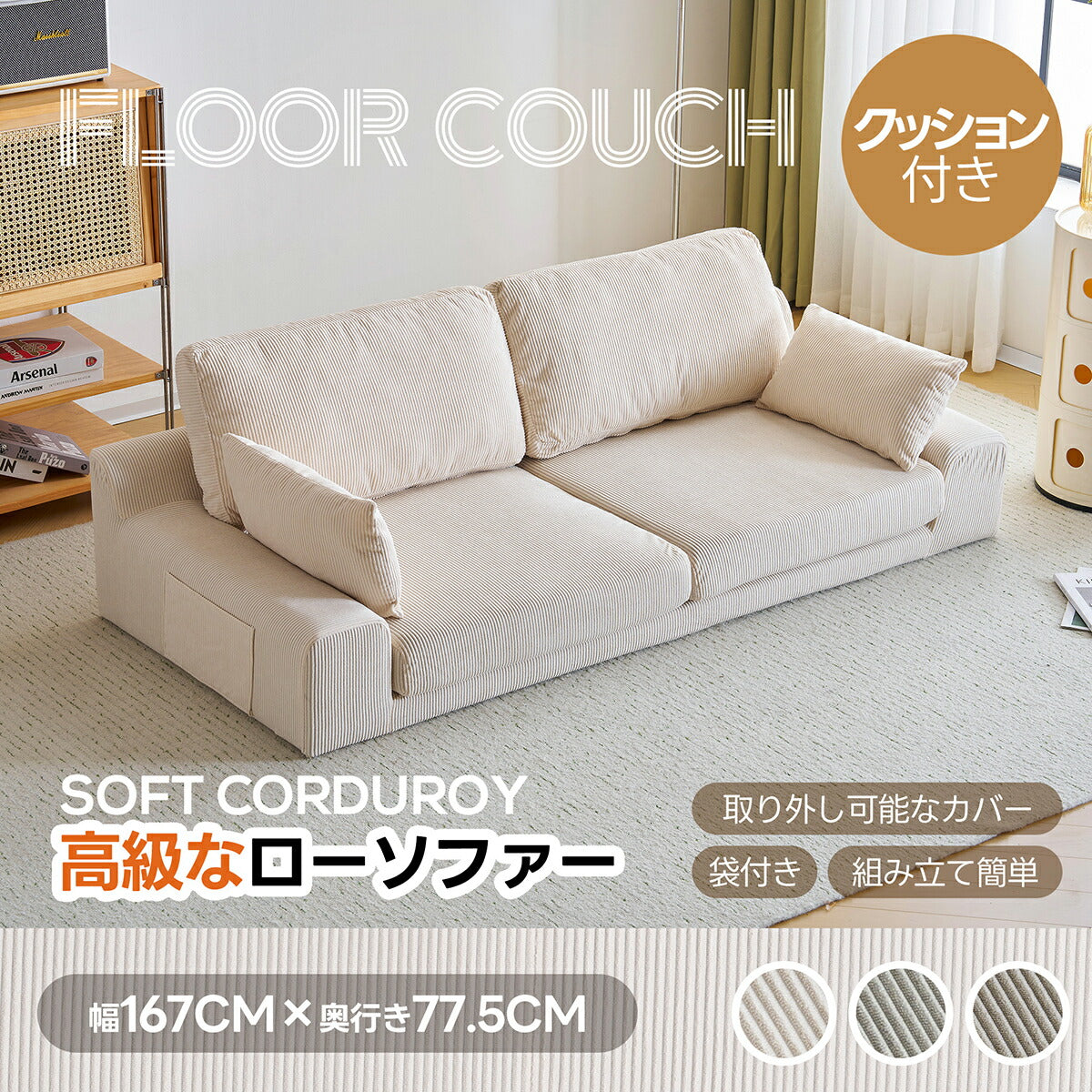 ◆商品説明 ■POINT1 ゆったりくつろげる2人掛けサイズ 横幅約167cm、座面奥行約62.5cmと、一般的な2人掛けソファよりゆとりのある設計。背もたれ高さ約36cmで、腕を預けたり寄りかかったりしやすく、リラックスした姿勢でくつろげます。 ■POINT2 簡単組立で一人暮らしにも安心 左右2つの座面を底部のバックルで連結し、カバーを取り付けるだけのシンプル構造。短時間で組み立てができ、一人暮らしの方にも扱いやすい仕様です。 ■POINT3 圧迫感のないシンプルデザイン 落ち着いた色合いと低めの設計で、お部屋に圧迫感を与えにくいデザイン。直線的でシンプルなフォルムは、さまざまなインテリアに自然に馴染みます。 ■POINT4 洗濯できて清潔に使える布カバー カバーは取り外して洗濯可能。ソファ本体やクッションと分けてお手入れでき、いつでも清潔な状態を保てます。 ■POINT5 便利なクッション&サイドポケット付き 付属クッションは枕や腰当てとして使えるほか、読書時の姿勢調整にも便利。サイドポケットには雑誌や本を収納でき、くつろぎ時間を快適にサポートします。 |