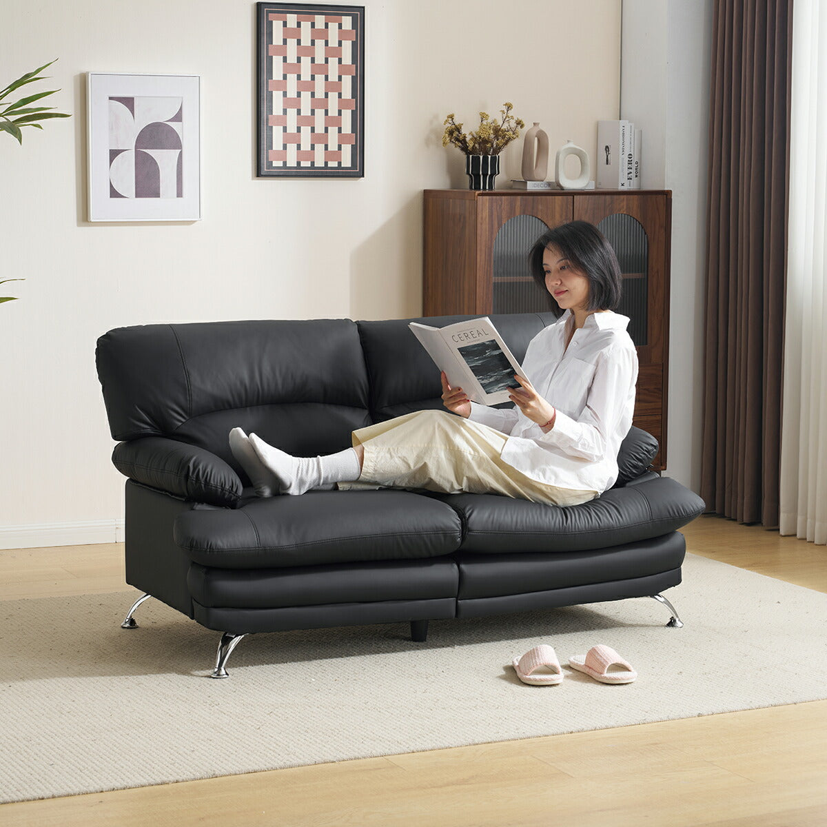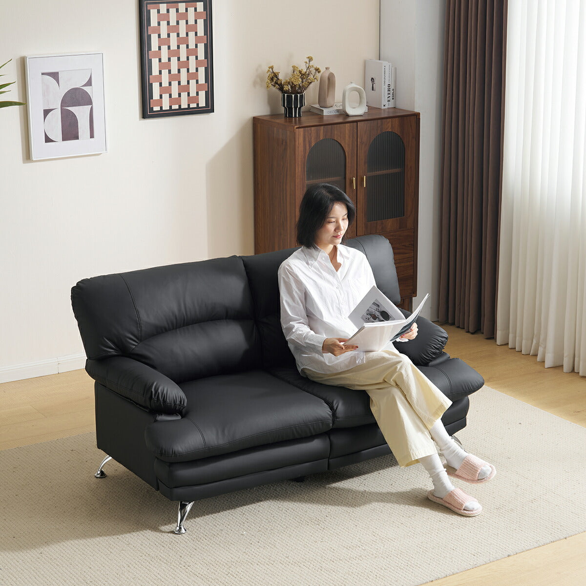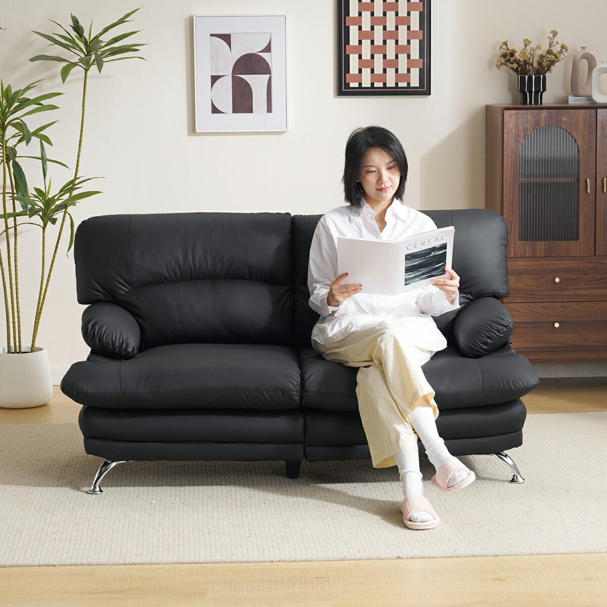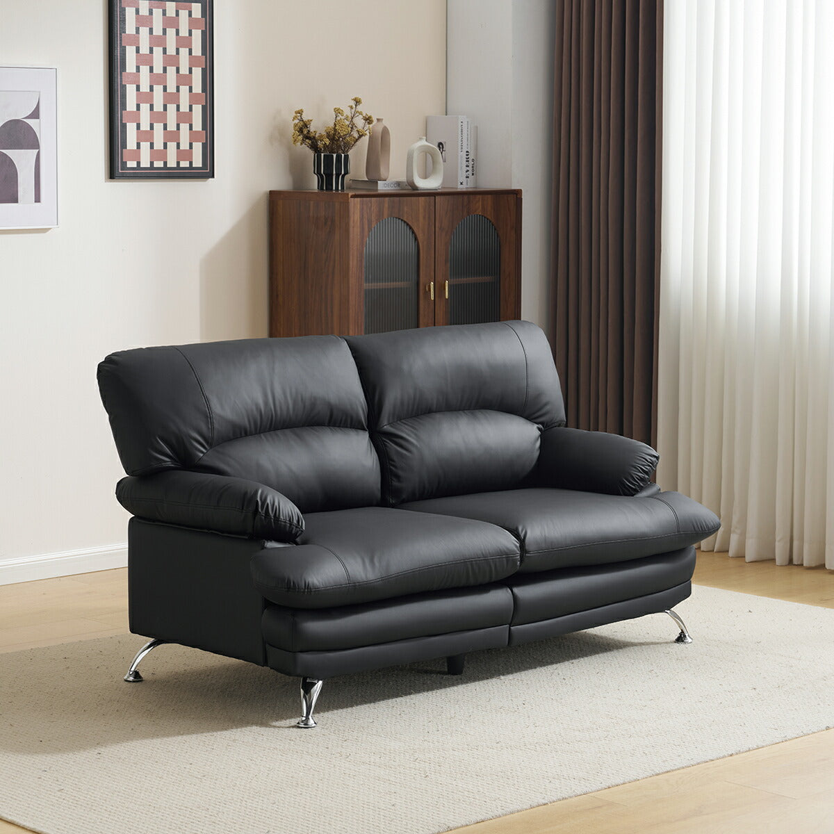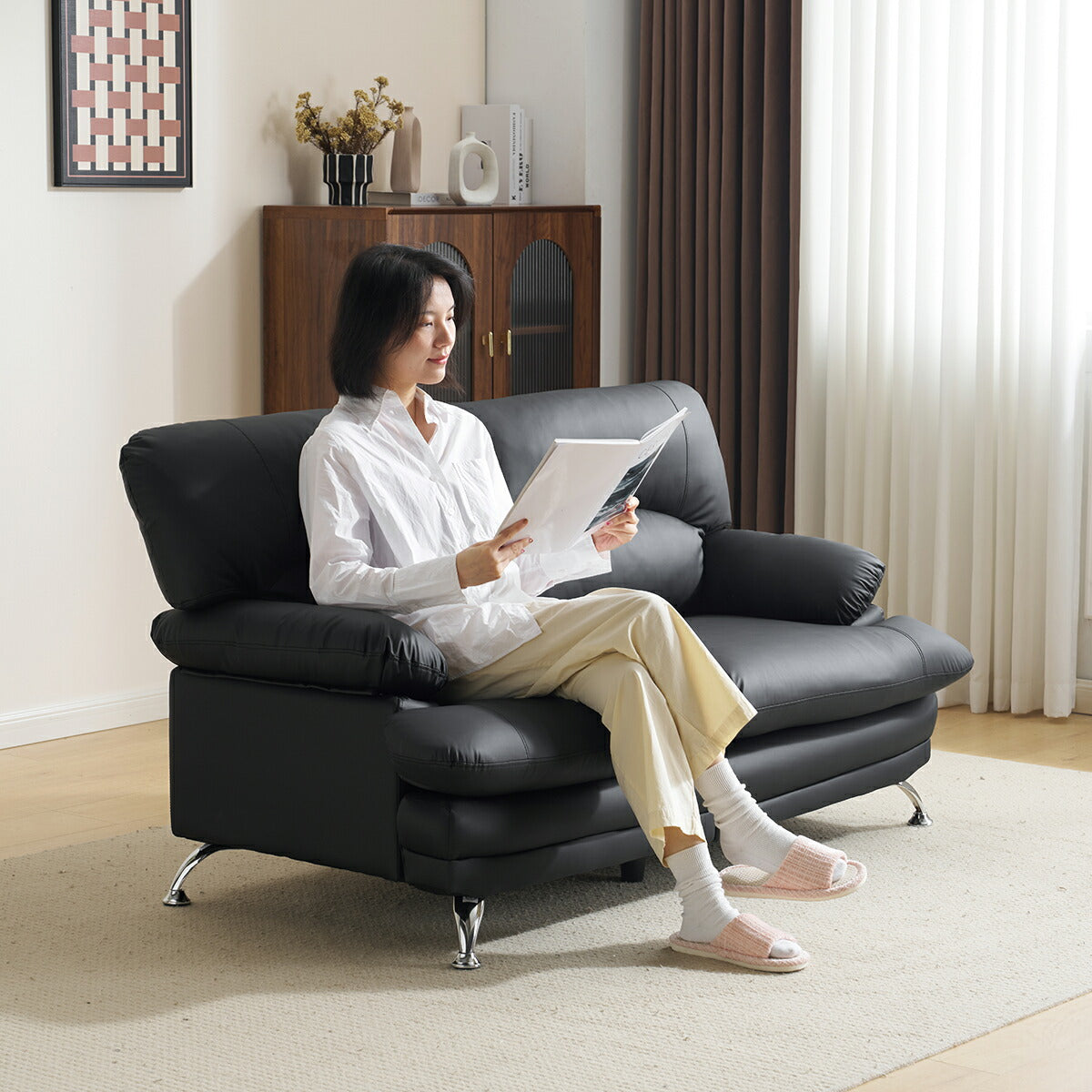 商品名 ソファ 商品番号 djyc-sofa-025 生産国 中国 組立状態 完成品 素材 ファブリック サイズ(約) ・155cm×81cm×86cm ポイント ◆商品説明 ■POINT1 上品なフォルムと心地よい座り心地 見た目と使い心地のバランスにこだわった2人掛けソファ。お部屋に置くだけで、やさしく落ち着いた雰囲気を演出します。 ■POINT2 ふんわり快適なクッション設計 背もたれ・座面ともに厚みのあるクッションを採用。体をやさしく支え、長時間座っても疲れにくい、リラックス感のある座り心地です。 ■POINT3 ゆとりのあるアームレスト 丸みを持たせたアームデザインで、肘を自然に預けられる形状。寄りかかったり、腕を休めたりと、くつろぎの姿勢を快適にサポートします。 ■POINT4 洗練されたメタル脚デザイン 滑らかなラインのメタル脚が、空間に軽やかさと上品さをプラス。見た目だけでなく、安定感もしっかり確保しています。 ■POINT5 お掃除しやすい脚高設計 脚部に高さがあるため、掃除機やロボットクリーナーも入りやすく、日々のお手入れがスムーズ。清潔な空間を保ちやすい構造です。 ■POINT6 背面まで美しい仕上がり 背面まで丁寧に仕上げたデザインで、お部屋の中央に配置しても違和感なく、すっきりとした印象を保ちます。 ■POINT7 お手入れしやすいPUレザー素材 水拭き可能で、日常のお手入れが簡単。キズに強く扱いやすいPUレザーを使用し、本革調の上品な質感で季節を問わず快適に使えます。 特記事項 ※こちらの商品は基本的に玄関先でのお渡しとなります。...