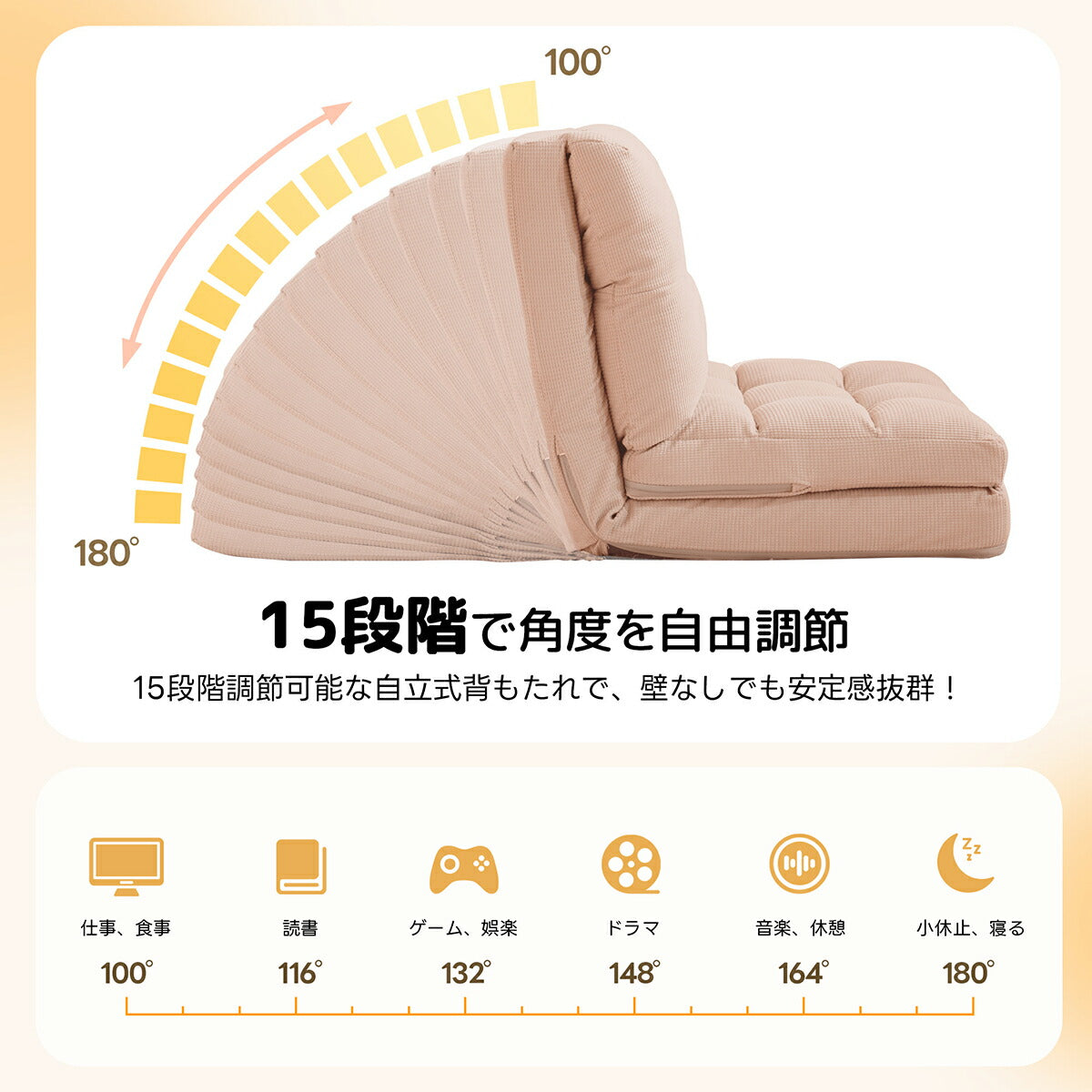 ◆商品説明 ■POINT1 多機能で使いやすいデザイン シーンに合わせて形を変えられ、座椅子としてもベッドとしても使用可能。最大約178cmまで広げられ、座る・横になるなど幅広い使い方に対応します。省スペース設計で、小さなお部屋にも最適です。 ■POINT2 ふっくら快適な座り心地 やわらかなクッション材を使用し、座る時も横になる時も快適。体をやさしく支え、長時間使用しても疲れにくい設計です。 ■POINT3 使いやすいサイズ感 座椅子時はコンパクト(幅約50cm・高さ約48cm)で場所を取らず、ベッド時は十分な長さを確保。体格を問わず、さまざまなシーンで活躍します。 ■POINT4 シンプルで上品なデザイン 落ち着いたデザインと繊細なテクスチャが、さまざまなインテリアに自然に馴染み、空間にやさしい雰囲気をプラスします。 ■POINT5 背もたれ15段階リクライニング 15段階の調整機能により、しっかり座る姿勢からリラックスした角度、フラットに近い状態まで自在に調節可能。首や背中を心地よく支え、用途に合わせた快適な姿勢を実現します。 ■POINT6 コンパクトで置き場所自由 寝室や書斎、リビングの一角はもちろん、限られたスペースにも設置しやすいサイズ感。省スペースでもくつろぎの空間を作れます。 |