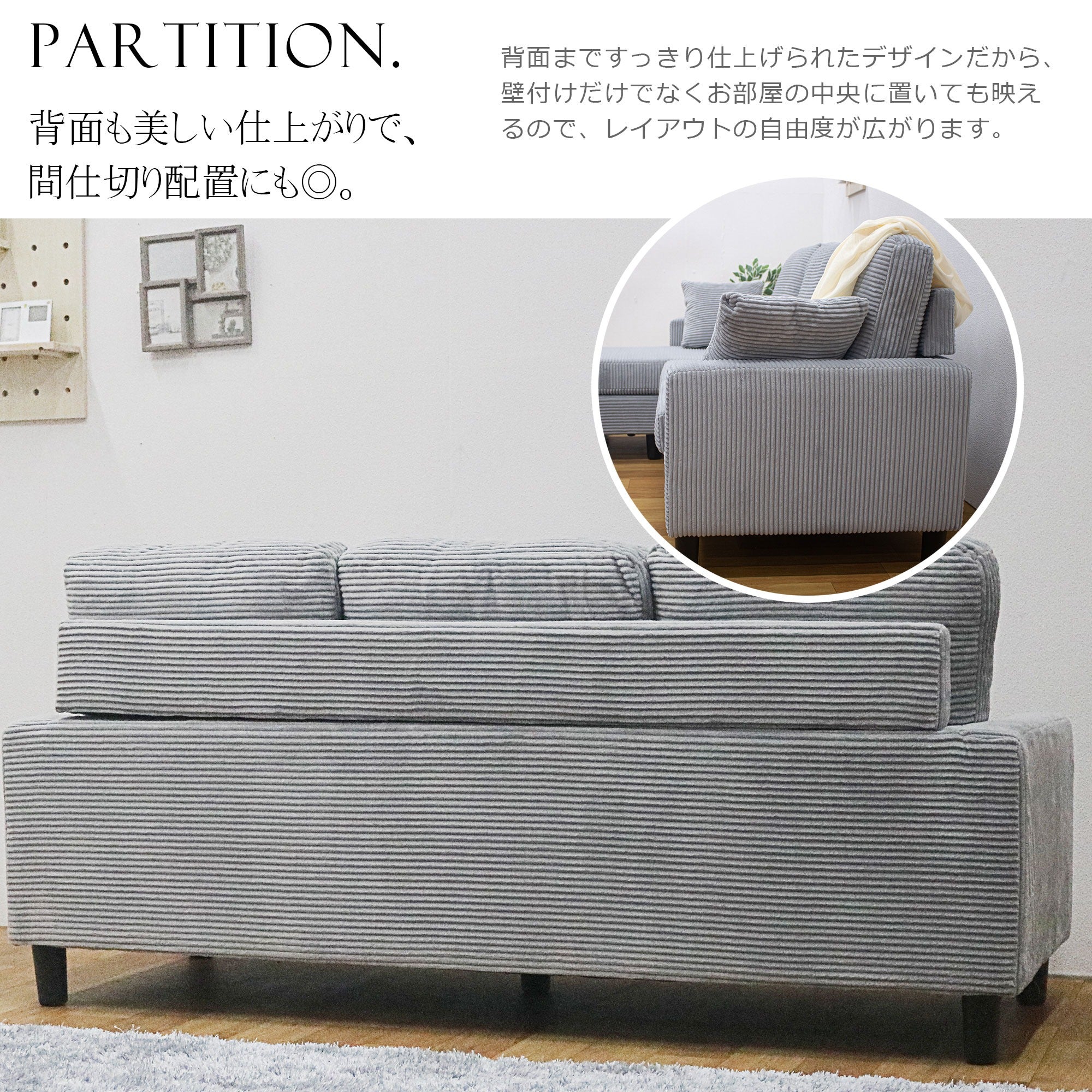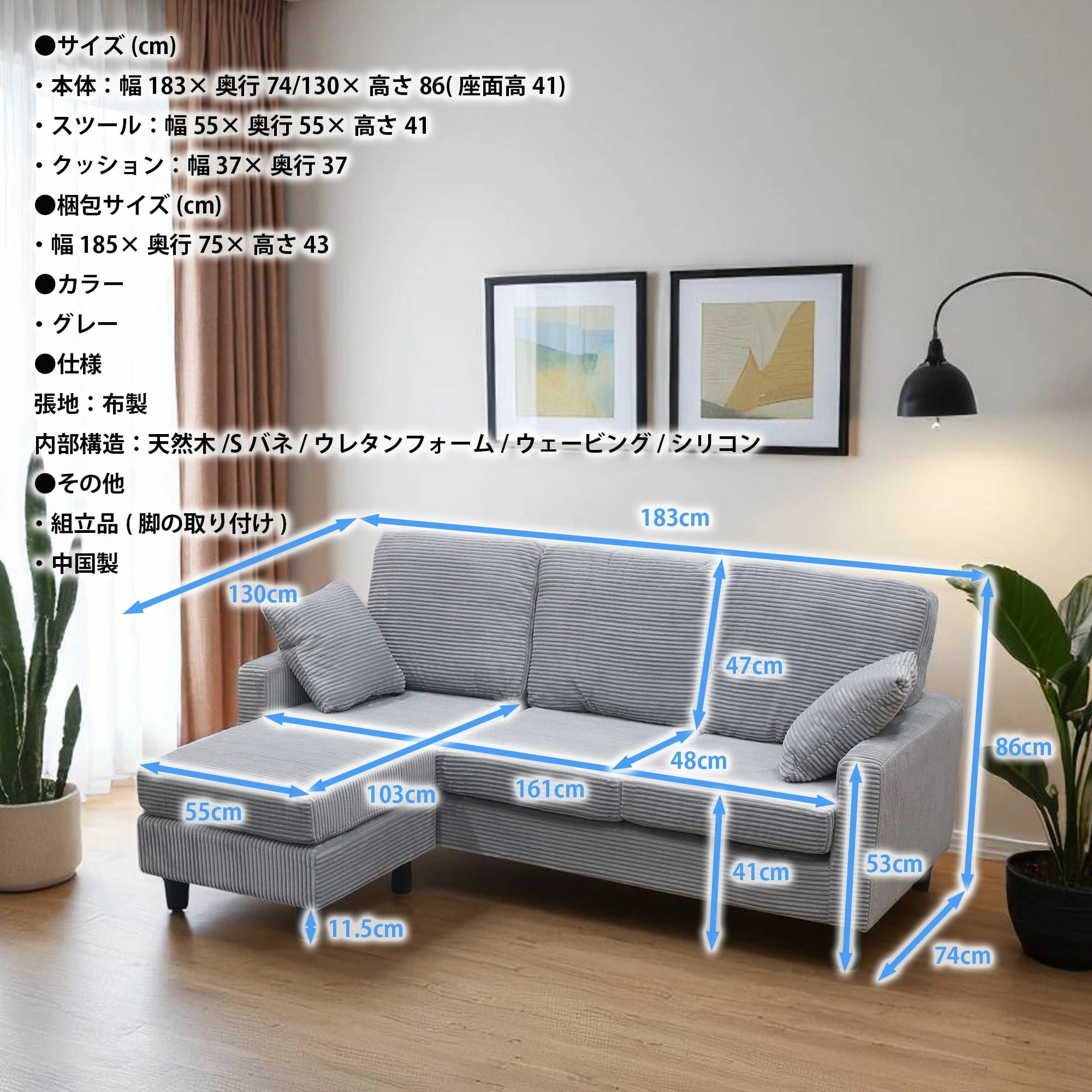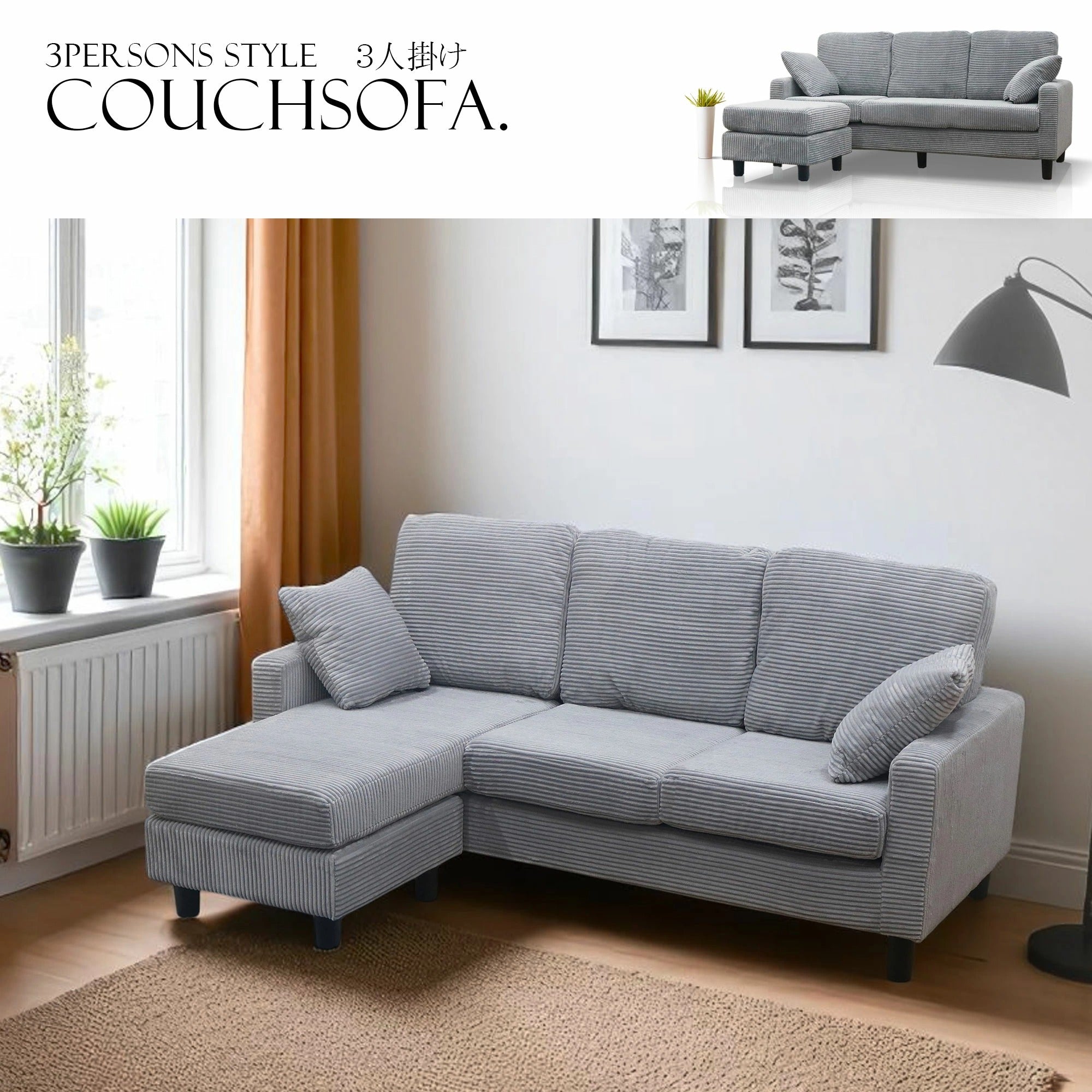 ソファ・カウチソファ・3人掛け・幅約180cm・北欧・おしゃれ・布製・オットマン・スツール付き・L字・グレー クッション付き・おすすめ・コーデュロイ・7日内出荷