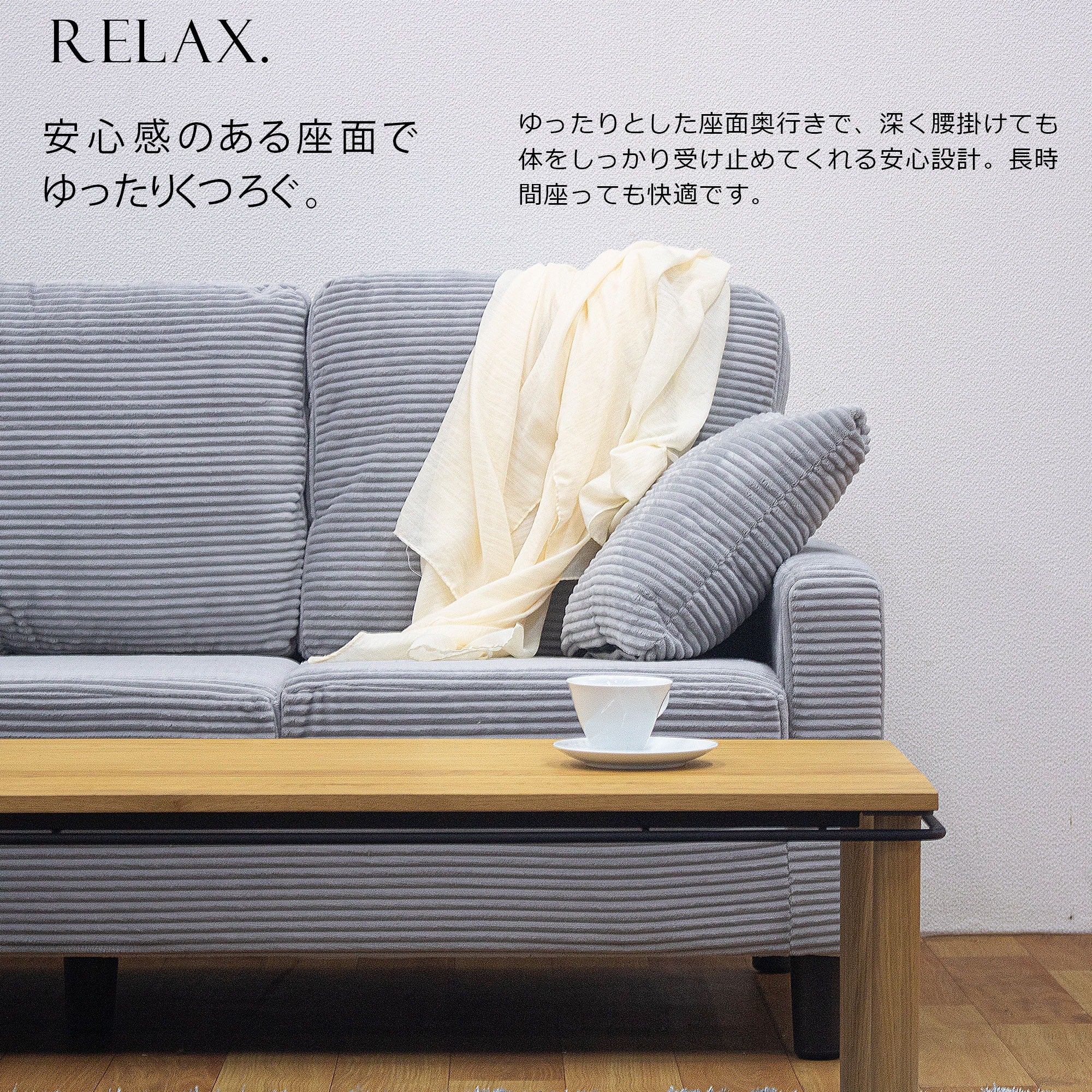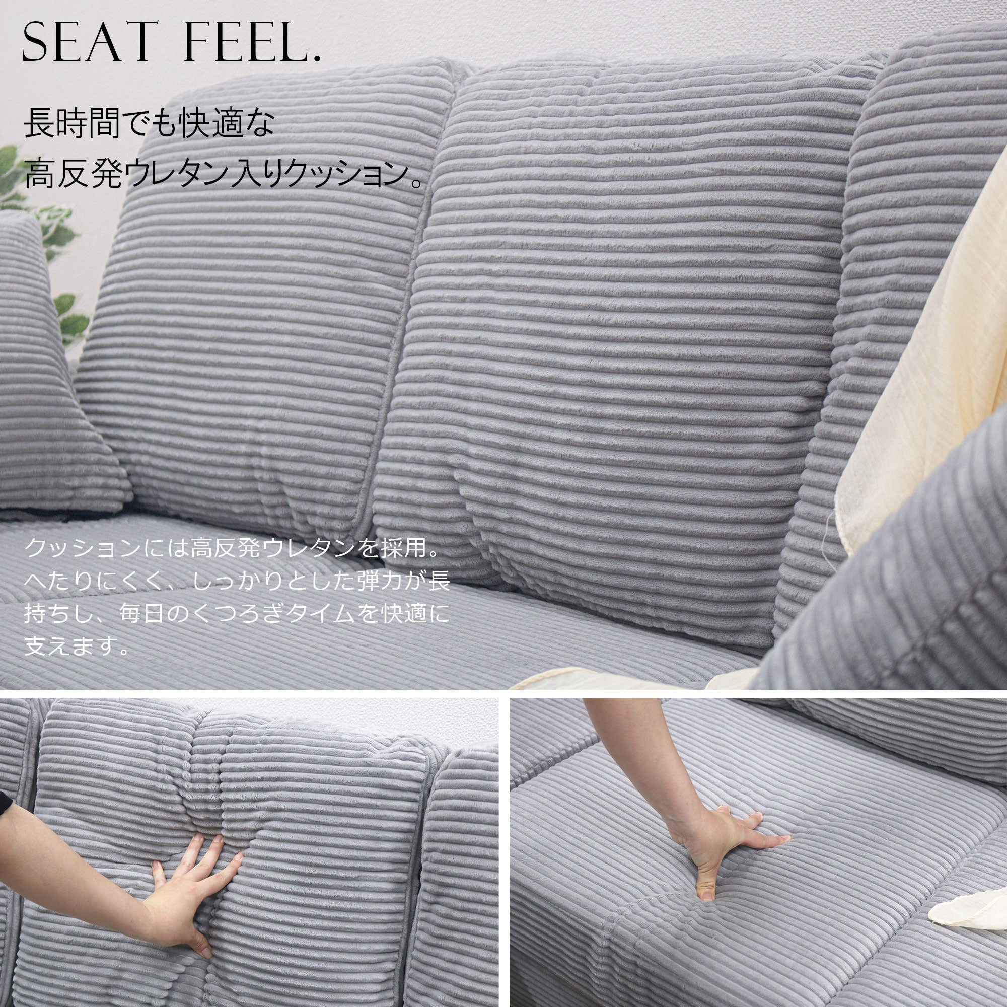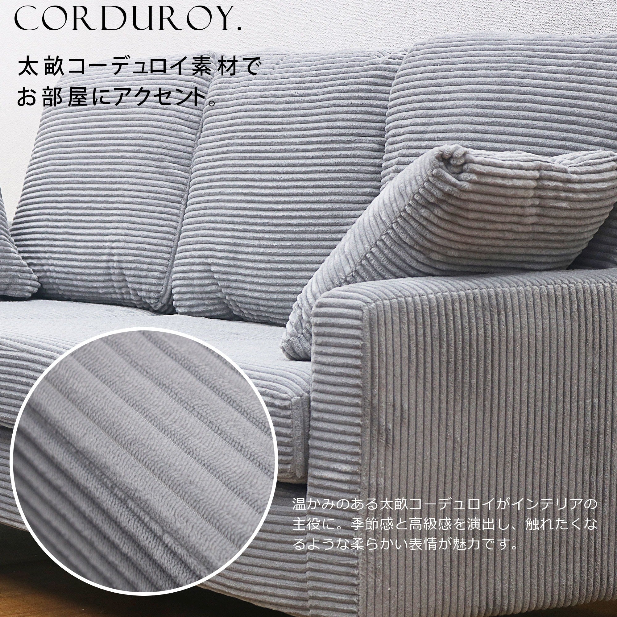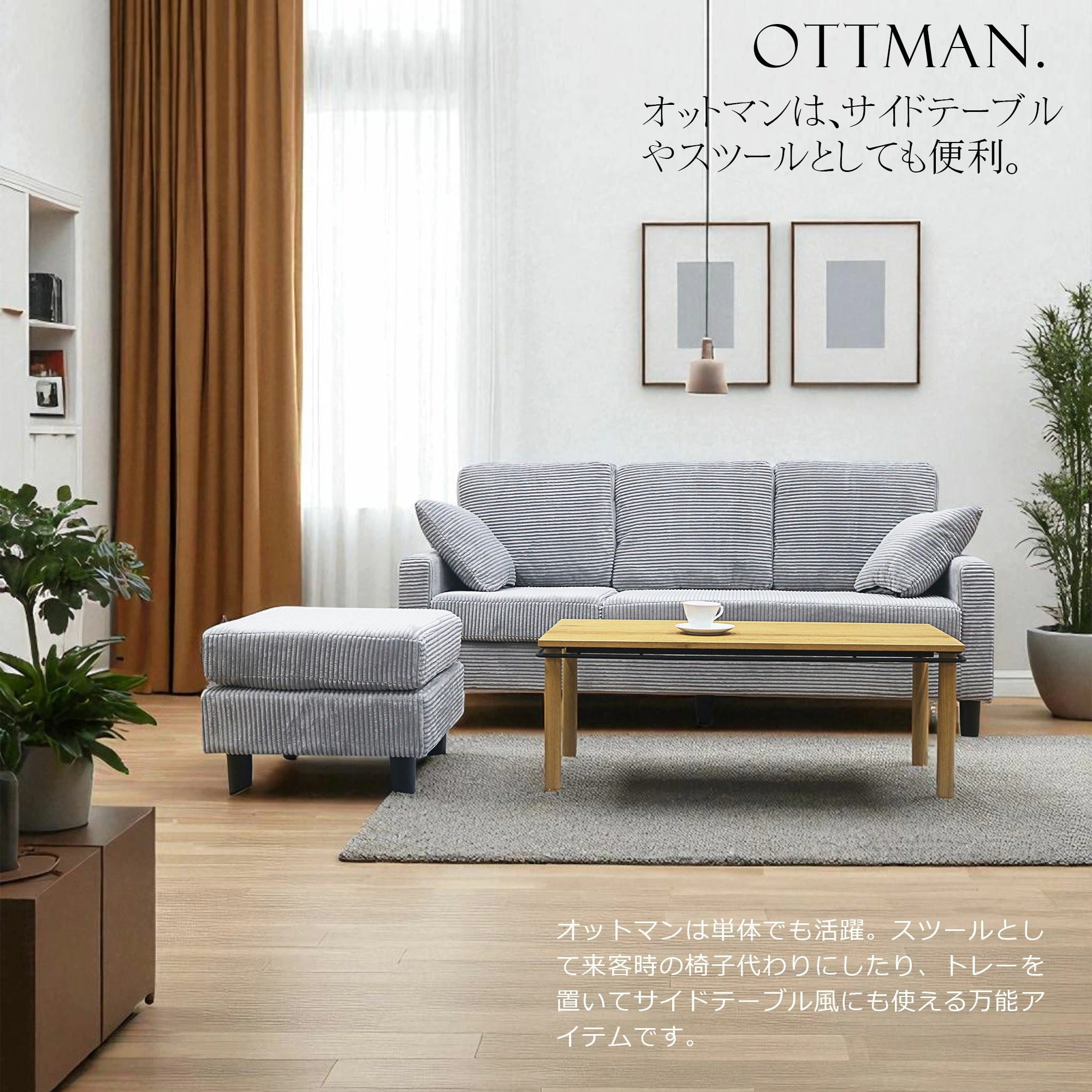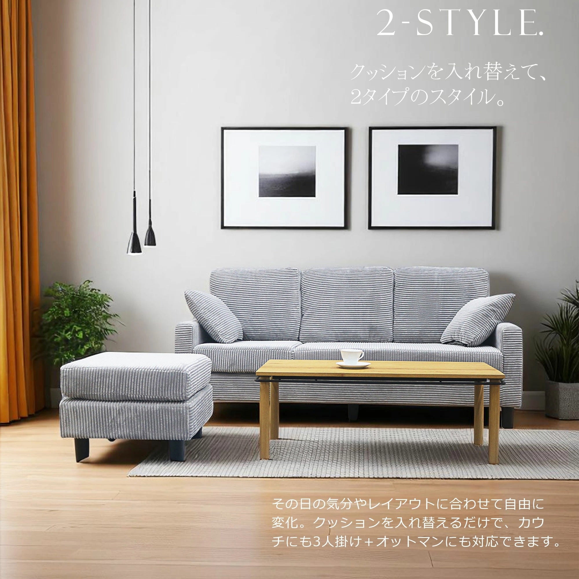 座面クッションの置き方を変えるだけで、3人掛けソファとしてもL字カウチソファとしても使える多機能ソファです。付属のオットマンを組み合わせれば、足を伸ばしてリラックスしたり、スツールとしても活用可能。ライフスタイルやお部屋の間取りに合わせて、自由自在にレイアウトできます。 幅約180cmのゆったりサイズで、ご家族や来客時にも快適にお使いいただけます。張地にはおしゃれなコーデュロイ生地を採用し、柔らかな肌触りと落ち着いた雰囲気がリビングにぴったり。シンプルなデザインで北欧テイストやモダンなお部屋とも相性抜群です。 クッション付きで座り心地も快適。日常使いに便利で、リビングをより快適な空間にしてくれるおすすめのソファです。