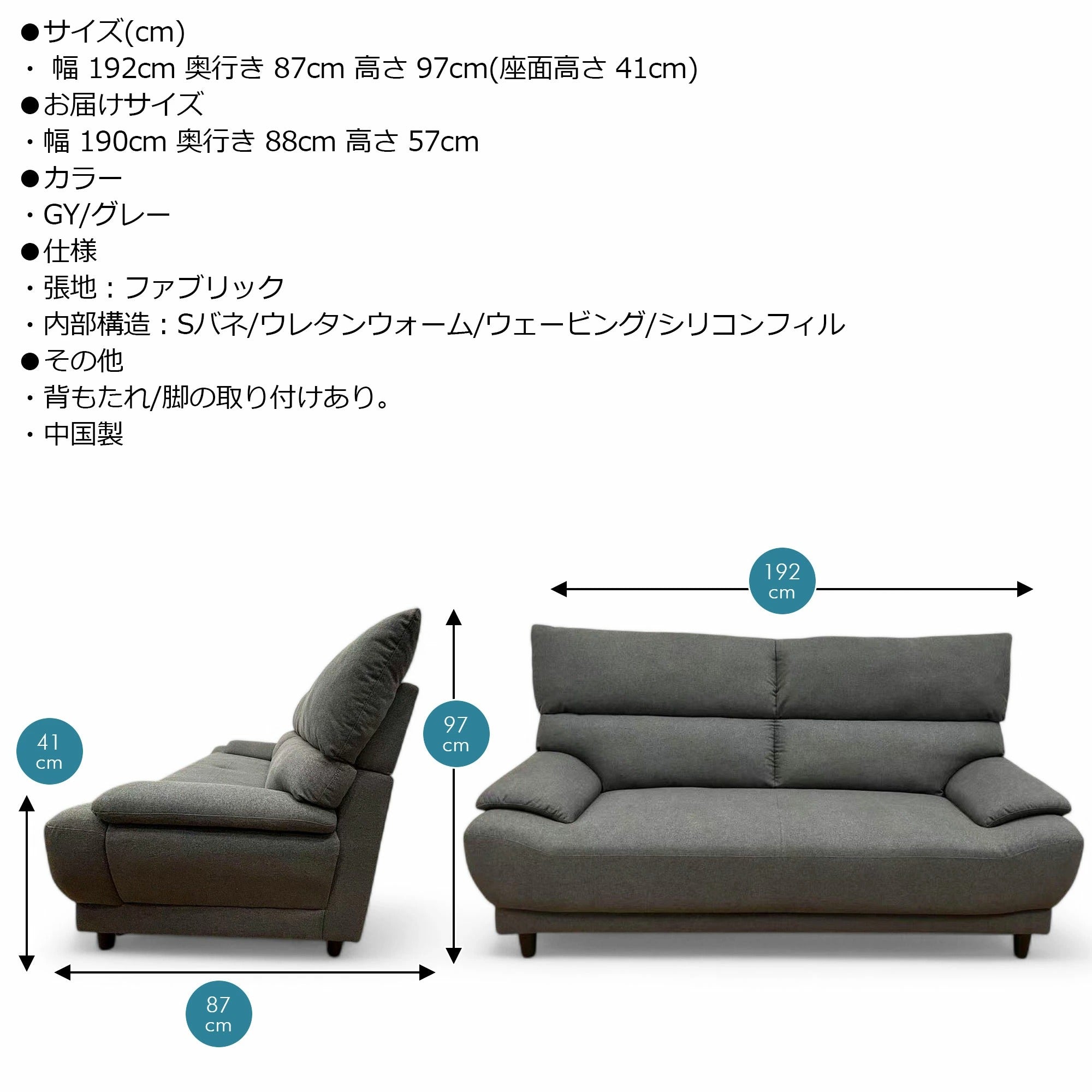 ・ 幅 192cm 奥行き 87cm 高さ 97cm(座面高さ 41cm)