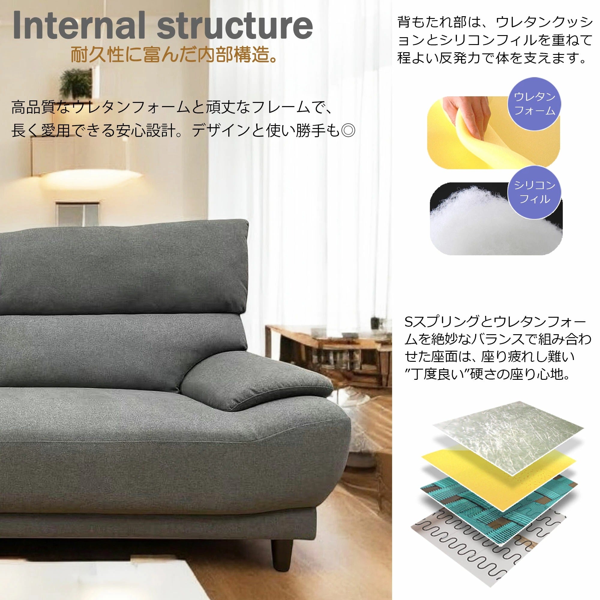 ・内部構造:Sバネ/ウレタンウォーム/ウェービング/シリコンフィル