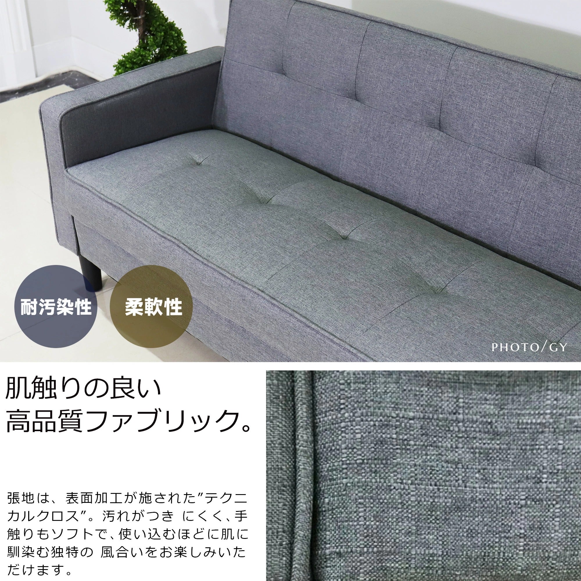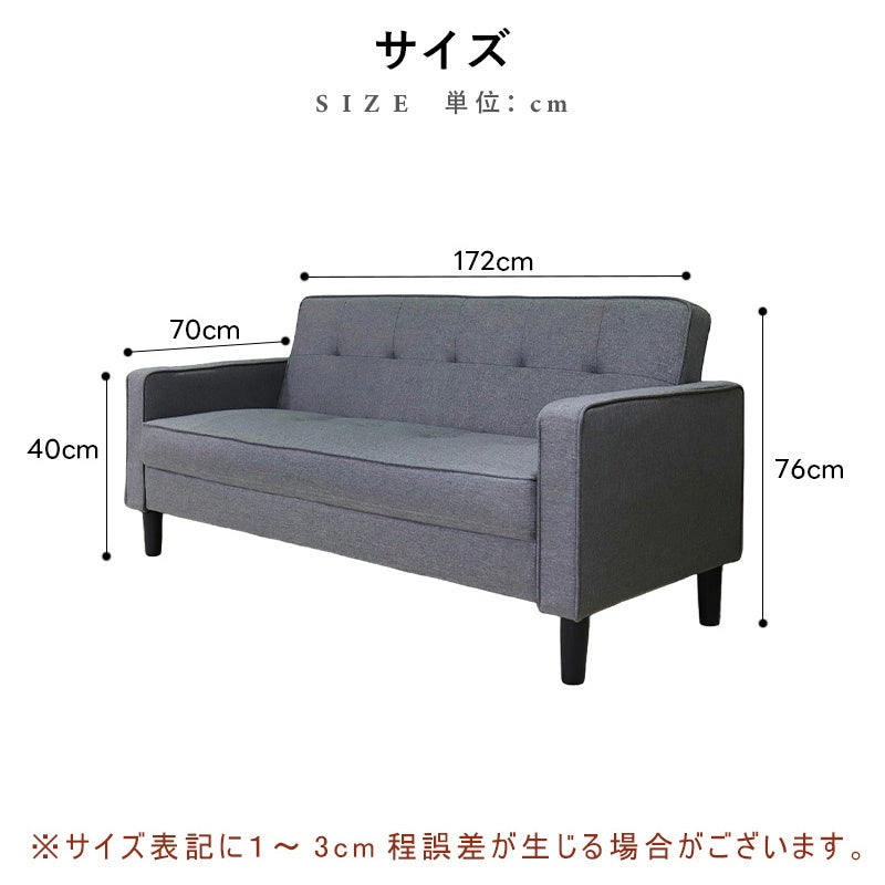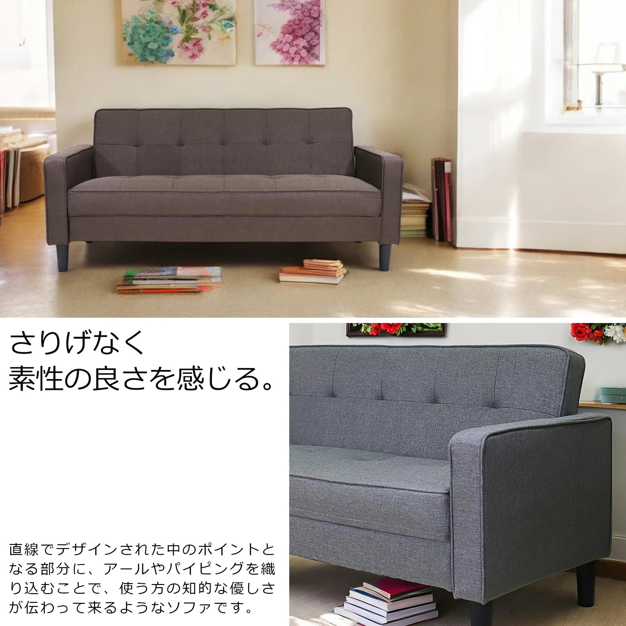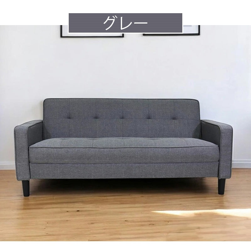 シンプルなデザインの三人掛けソファーは、肌触りの良いファブリック素材。脚付きタイプでお掃除がしやすいのもおすすめポイントです。