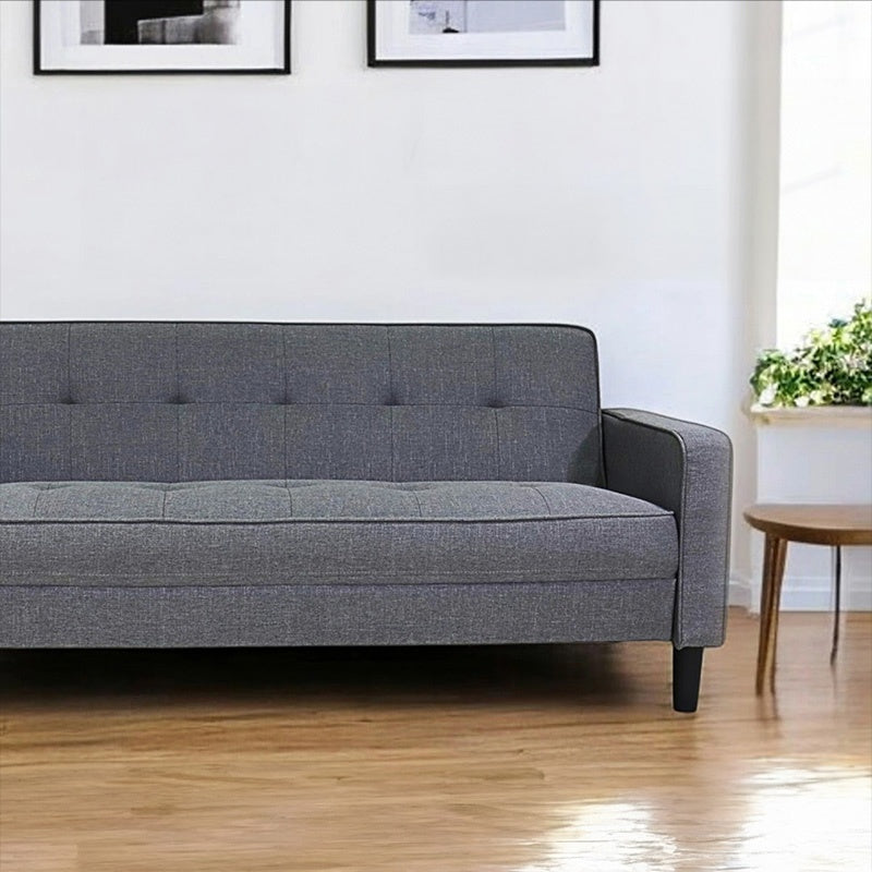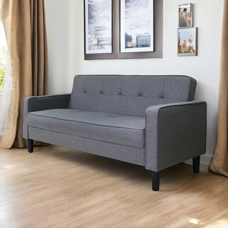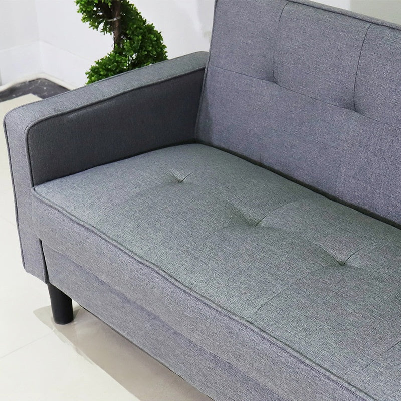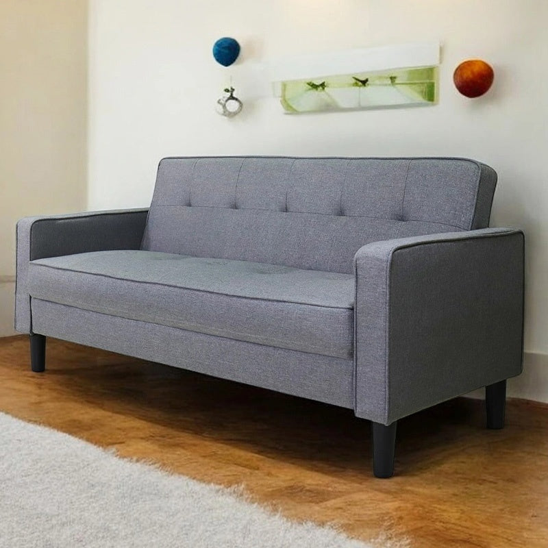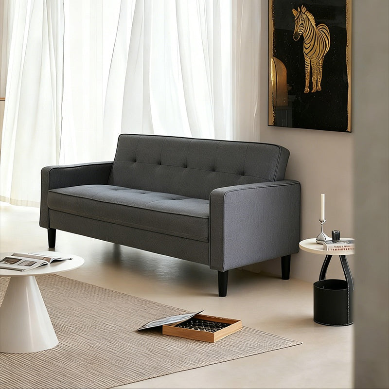 シンプルなデザインの三人掛けソファーは、肌触りの良いファブリック素材。脚付きタイプでお掃除がしやすいのもおすすめポイントです。