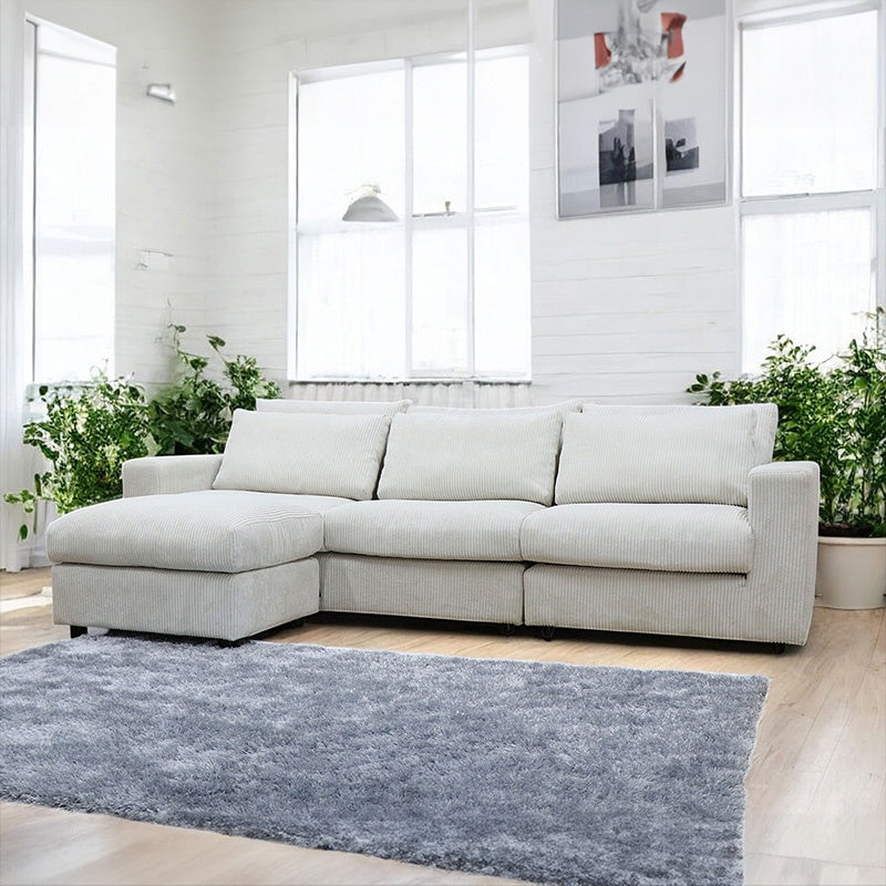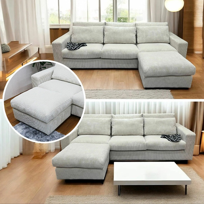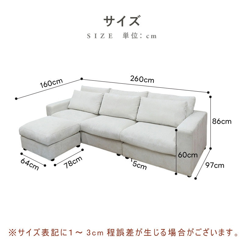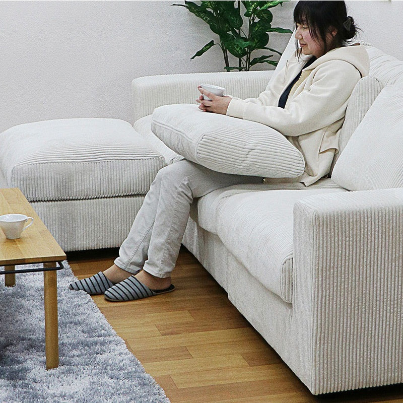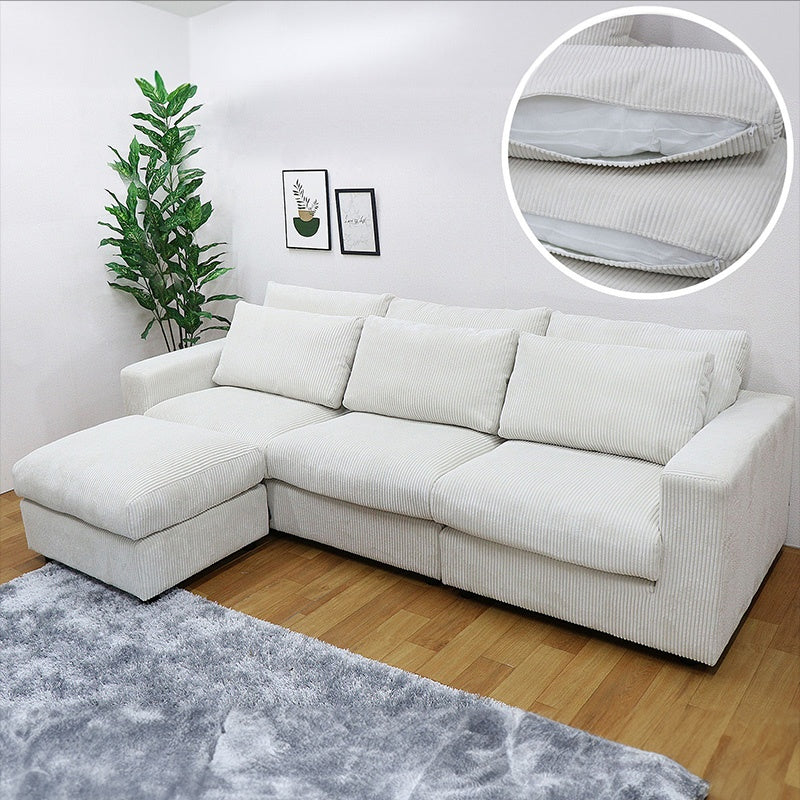ソファ カウチソファー 大型 幅260cm 大きめ 北欧 おしゃれ ファブリック 布 3人掛け 4人掛け スツール付き シェーズロング l字ソファー クッション付き おすすめ アイボリー コーデュロイ