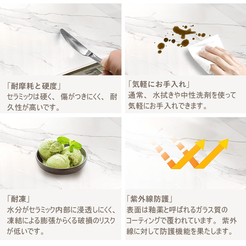 ◆商品説明 天板に耐熱・耐久性に優れたセラミックを使用した。 ■POINT1 耐摩耗と硬度 セラミックは硬く、傷がつきにくく、耐久性が高いです。 ■POINT2 耐熱 熱い鍋や器具を直接置いても、表面が損傷しにくいため、キッチンなどでの使用に適しています。 ■POINT3 気軽にお手入れ 通常、水拭きや中性洗剤を使って気軽にお手入れできます。 ■POINT4 防水 液体の吸収率はほぼ0%で、水分や液体が内部に侵入するのを防ぎます。 ■POINT5 耐凍 水分がセラミック内部に浸透しにくく、凍結による膨張からくる破損のリスクが低いです。 ■POINT6 紫外線防護 セラミックの表面は釉薬と呼ばれるガラス質のコーティングで覆われています。 この釉薬層は紫外線に対して防護機能を果たします。 ■POINT7 モダンでラグジュアリーなデザイン 全体をシンプルで洗練されたフォルムに仕上げ、丸角の柔らかなラインが上質でエレガントな雰囲気を演出します。 ■POINT8 ローボード構造で安定感抜群 重心の低い落地式設計により、安定性と耐久性を両立。長期使用にも安心です。 ■POINT9 奥行き35cmの省スペース設計 コンパクトな奥行きで省スペースながら、収納力と実用性を確保しています。 ■POINT10 5年保証付きで安心の品質 長期使用にも耐える高品質な製品で、5年間の保証が付いており、安心してお使いいただけます。 |