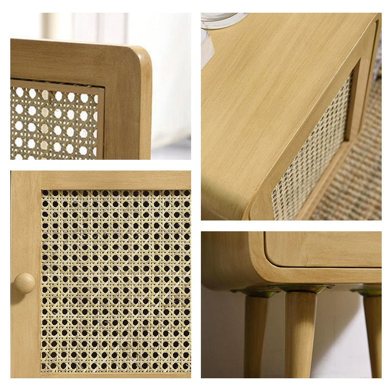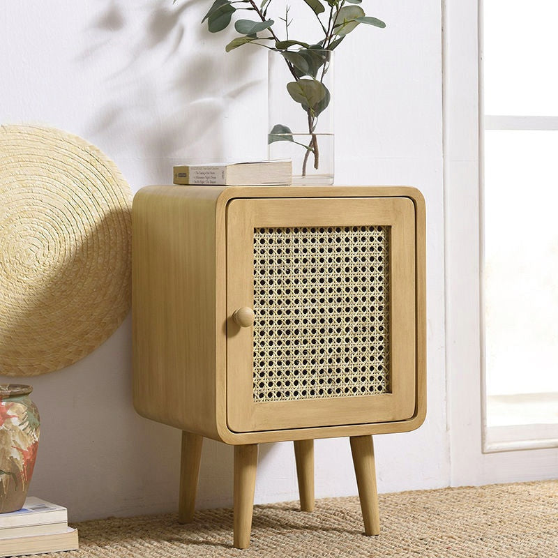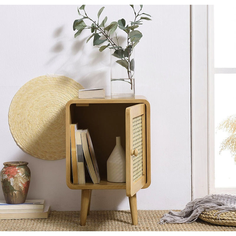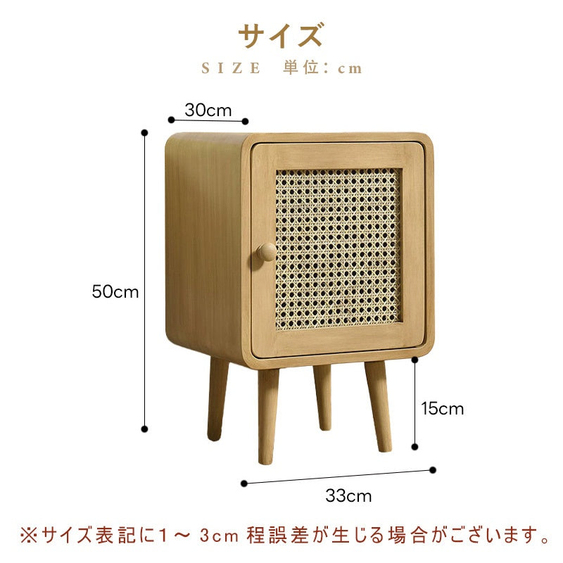 商品名 ナイトテーブル 商品番号 gsou-btable-002 生産国 中国 組立状態 簡単組立品:脚の取り付けが必要(組立説明書を同梱発送いたします) 素材 繊維板、籐 サイズ(約) ・幅33x奥行30x高さ50cm ポイント ■POINT1 リモコンや雑誌スッキリ収納 奥側の収納スペースには、新聞や雑誌などの大きめの本を。 ■POINT2 くつろぎの時間を更に快適に ソファ横に置く「サイドテーブル」というと、小さめのテーブルで飲み物を置くだけのタイプが多く、収納力に欠けるものが一般的。 ですが弊社の商品はソファサイドにぴったりの高さ50cmで、文庫本やDVDも収納可能です。 ソファでくつろぐ時間を、より快適なものにしてくれること間違いなしです! ■POINT3 軽量かつ丈夫 籐は非常に軽量かつ柔軟でありながらも丈夫です。そのため、ナイトテーブルを移動したり配置を変えたりするのが簡単で、同時に耐久性があります。 ■POINT4 通気性がある 籐は通気性が高いため、湿気を吸収・放出することができます。これにより、湿気やカビの発生を防ぎ、ナイトテーブル上の物品を保護します。 ■POINT 多様なインテリアに適応 籐編みのナイトテーブルは、様々なインテリアに馴染みます。そのナチュラルで柔らかい雰囲気は、モダンな部屋からボヘミアンスタイルの部屋まで幅広くマッチします。 特記事項 ※モニターにより実際の色と異なる場合がございます。 ※予告なくデザインや仕様変更する場合がございます。 ※予告なく在庫切れになる場合がございます。 ※製造時期により、同シリーズであってもやむなく多少の色差が発生してしまう場合がございます。ご了承ください。...