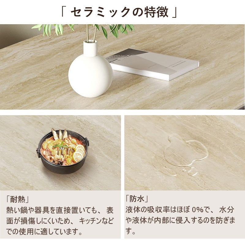 ポイント | ◆商品説明 天板に耐熱・耐久性に優れたセラミックを使用したダイニングテーブル。 ■POINT1 耐摩耗と硬度 セラミックは硬く、傷がつきにくく、耐久性が高いです。 ■POINT2 耐熱 熱い鍋や器具を直接置いても、表面が損傷しにくいため、キッチンなどでの使用に適しています。 ■POINT3 気軽にお手入れ 通常、水拭きや中性洗剤を使って気軽にお手入れできます。 ■POINT4 防水 液体の吸収率はほぼ0%で、水分や液体が内部に侵入するのを防ぎます。 ■POINT5 耐凍 水分がセラミック内部に浸透しにくく、凍結による膨張からくる破損のリスクが低いです。 ■POINT6 紫外線防護 セラミックの表面は釉薬と呼ばれるガラス質のコーティングで覆われています。 この釉薬層は紫外線に対して防護機能を果たします。 ■POINT7 楕円形のエレガントデザイン 丸みを帯びた楕円形の天板が空間に柔らかさを与え、優雅で上品な雰囲気を演出します。 ■POINT8 中古風とモダンの融合 落ち着いた木目の質感に岩板の洗練を組み合わせ、ヴィンテージ感と現代的な美しさを両立しました。 ■POINT9 天然木脚部の安定感 堅牢な天然木脚がテーブル全体をしっかり支え、長期使用にも安心の設計です。 ■POINT10 5年保証付きで安心の品質 長期使用にも耐える高品質な製品で、5年間の保証が付いており、安心してお使いいただけます。 |