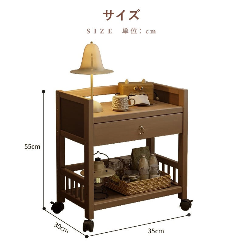 商品名 サイドテーブル 商品番号 sz-btable-003 生産国 中国 組立状態 要組立品(組立説明書を同梱発送いたします) 素材 竹 サイズ(約) ・幅35:幅35cm×奥行30cm×高さ55cm・幅50:幅50cm×奥行30cm×高さ55cm カラー ・ウォルナットカラー ポイント ◆商品説明■POINT1 竹製サイドテーブルで自然な質感天板には竹材を使用しており、軽やかな手触りとやさしい木目が空間に上質な温もりを与えます。■POINT2 360度回転キャスター付きで移動が簡単全方向にスムーズに動くキャスターを装備。掃除や模様替えの際もラクラク移動できます。■POINT3 取っ手×キャスターでさらに扱いやすいサイドの取っ手とキャスターを組み合わせた設計で、押す・引く動作がより軽快に。家中どこでも快適に運べます。■POINT4 引き出し収納で小物をスッキリ整理上段には引き出しを備え、文具やリモコンなど細かな物を見せずに収納可能。生活感を上手に隠せます。■POINT5 下段はオープン収納スペース雑誌やボトル類をそのまま置ける開放構造。取り出しが簡単でディスプレイにも最適です。■POINT6 落ち着いたウォールナットカラー深みのあるウォールナット色がインテリアに上品さを添え、さまざまなテイストに調和します。■POINT7 35cm/50cmの2サイズ展開で使い分け自由使用場所に応じて選べる2つの幅をご用意。省スペースにも広い空間にもぴったりフィットします。■POINT8 5年保証付きで安心の品質長期間使用にも耐える高品質な製品で、5年間の保証が付いており、安心してお使いいただけます。 特記事項 ※モニターにより実際の色と異なる場合がございます。※予告なくデザインや仕様変更する場合がございます。※予告なく在庫切れになる場合がございます。 ※製造時期により、同シリーズであってもやむなく多少の色差が発生してしまう場合がございます。ご了承ください。※領収書発行ご希望の場合、別途メールにてご連絡くださいませ。※ご購入の前に搬入経路のご確認をお願い致します。弊社ではお部屋に搬入出来ないなどのお客様ご都合による返品などはお受けできません。(不良品を除き返品交換不可となります。)※代金引換不可の商品です。※時間帯指定不可の商品です。※サイズ表記に1~2cm程誤差が生じる場合がございます。 キーワード ローテーブル センターテーブル コーヒーテーブル リビングテーブル ティーテーブル サイドテーブル 木製テーブル 大理石テーブル ガラステーブル 折りたたみテーブル...