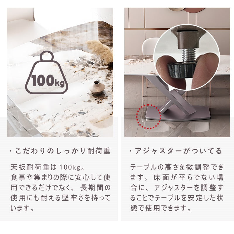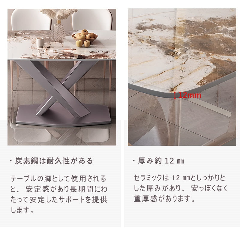 | ポイント | セラミック製の天板は高級感溢れる仕上がりで、洗練された雰囲気を演出するダイニングテーブル。 ■POINT1熱に強い 耐熱性が高く、短時間であれば高温のフライパンや鍋などを直接置いても大丈夫です。(しかし、天板にとっては良い事ではないので、出来るだけ何かを敷いて頂くことをお薦め致します。) ■POINT2 傷がつきにくい セラミック天板には塗装の膜が無いので、テーブル表面を傷める心配がありません。例えば、金属より高硬度なため、まな板代わりに使っても傷がつきません。タワシでゴシゴシ洗っても大丈夫な仕様になっています。 ■POINT3 汚れに強い セラミックトップは熱に強く、傷がつきにくいだけではなく、食材や油などの汚れも染み込みません。紫外線で色あせることもありませんので、いつまでもきれいな状態を保ちます。さらにアルコールスプレーなどを使用することで、除菌もできるのでいつでも清潔にお使い頂けます。全体的に丸みを帯びたデザインで、柔らかい印象を与えます。 ■POINT4 特徴のある素材感、質感が高い セラミックトップの表面は、焼きものならではの凹凸のあるテクスチャ。従来の天板素材とは全く異なる素材感です。また色あせや変色の原因となる空気や紫外線に対しても、耐性が強いので、綺麗な天板が長持ちします。 |