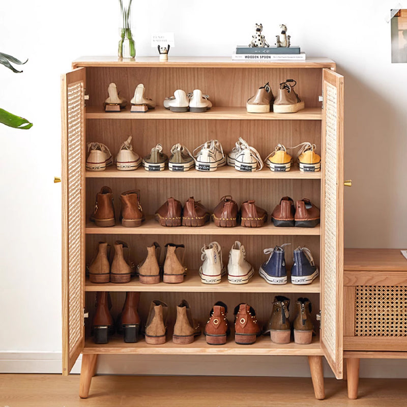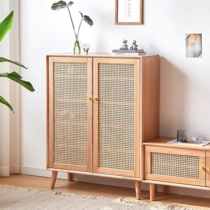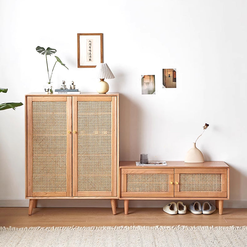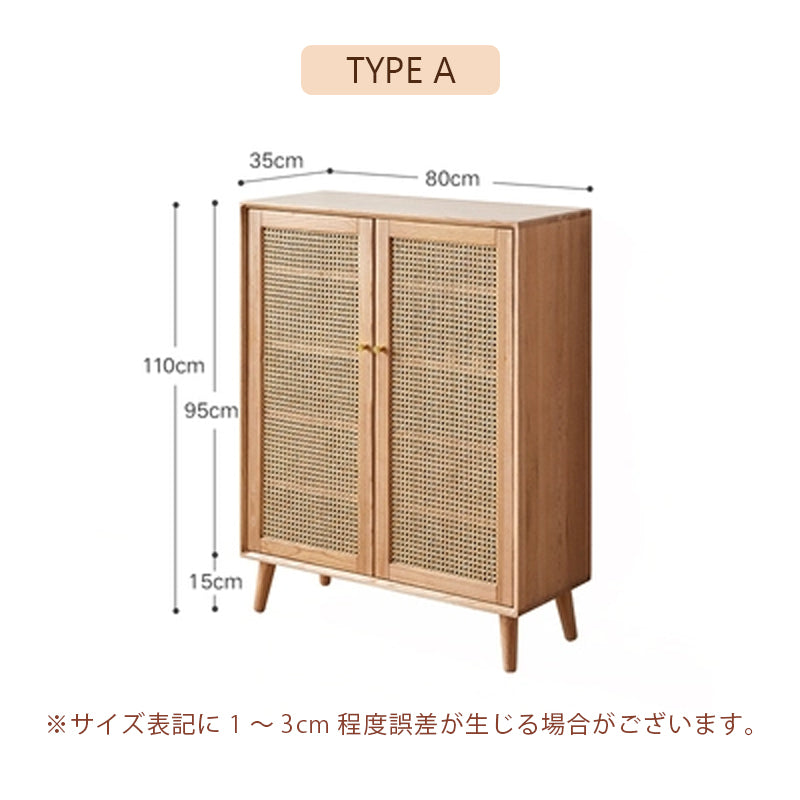 商品名 シューズボックス 商品番号 ymxz-scs-001 生産国 中国 組立状態 簡単組立品(脚の取り付けが必要) 仕様 天然木 サイズ(約) ・TYPE-A:幅80x奥行35x高さ110cm ・TYPE-B:幅100x奥行35x高さ45cm ポイント ■POINT1 実木使用でぬくもりある質感 本体には天然木を贅沢に使用。木目の美しさと自然素材の風合いが,お部屋にやさしい温もりをもたらします。 ■POINT2 大小選べる2サイズ展開 【80×35×100cm】【115×35×100cm】の2サイズをご用意。使用スペースや収納量に応じて,お好みのサイズをお選びいただけます。 ■POINT3 たっぷり収納できる大容量設計 収納部は高さのある棚構造で,靴や小物をすっきりと片付けられます。家族みんなの収納にも十分対応します。 ■POINT4 上部は広々としたディスプレイスペースに 天板は植物やアート,鍵置き場など,多目的に使える便利なスペース。インテリアとしても楽しめます。 ■POINT5 ラタン調パネルで通気性アップ 扉には通気性に優れたラタン調の格子パネルを採用。湿気がこもりにくく,靴収納にもぴったりです。 ■POINT6 金属製取っ手で長く使える耐久性 扉の取っ手には金属素材を採用。開閉しやすく,日常使いに適した高い耐久性を備えています。 ■POINT7 角を丸く仕上げた安心設計 天板や本体の角は丸く加工されており,小さなお子様のいるご家庭でも安心してお使いいただけます。 ■POINT8 高さ15cmのオープンスペース付き 下段には使いやすい2段構造のオープンスペース。スリッパやよく履く靴を手軽に収納でき,さっと履いてお出かけできます。...